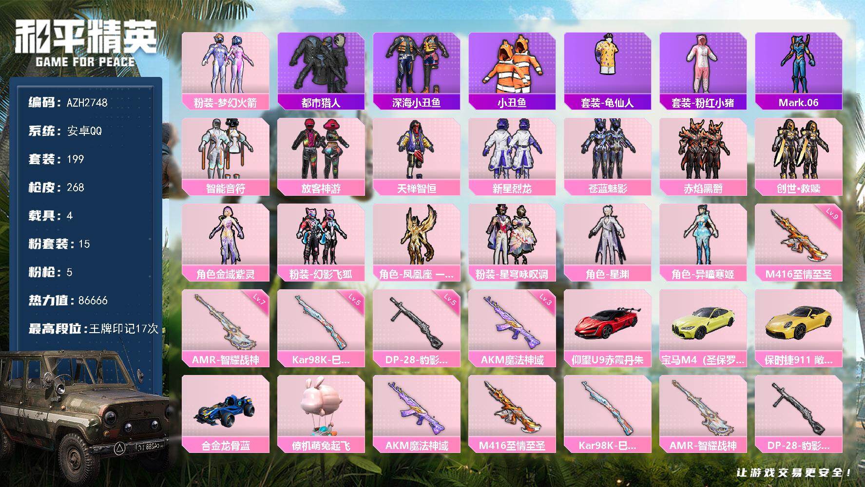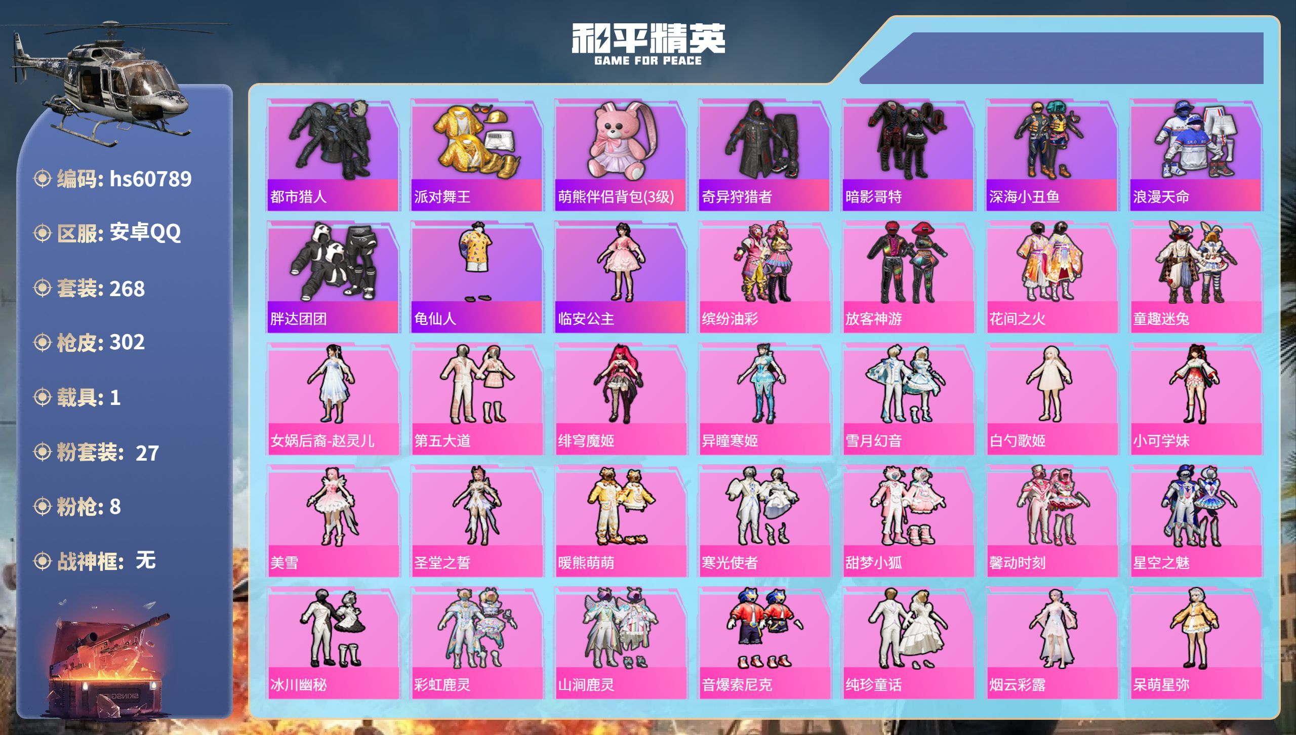 hs60789 安卓手Q-19王牌印记-27粉装-8特效枪-1载具-111099热力值-268套装-