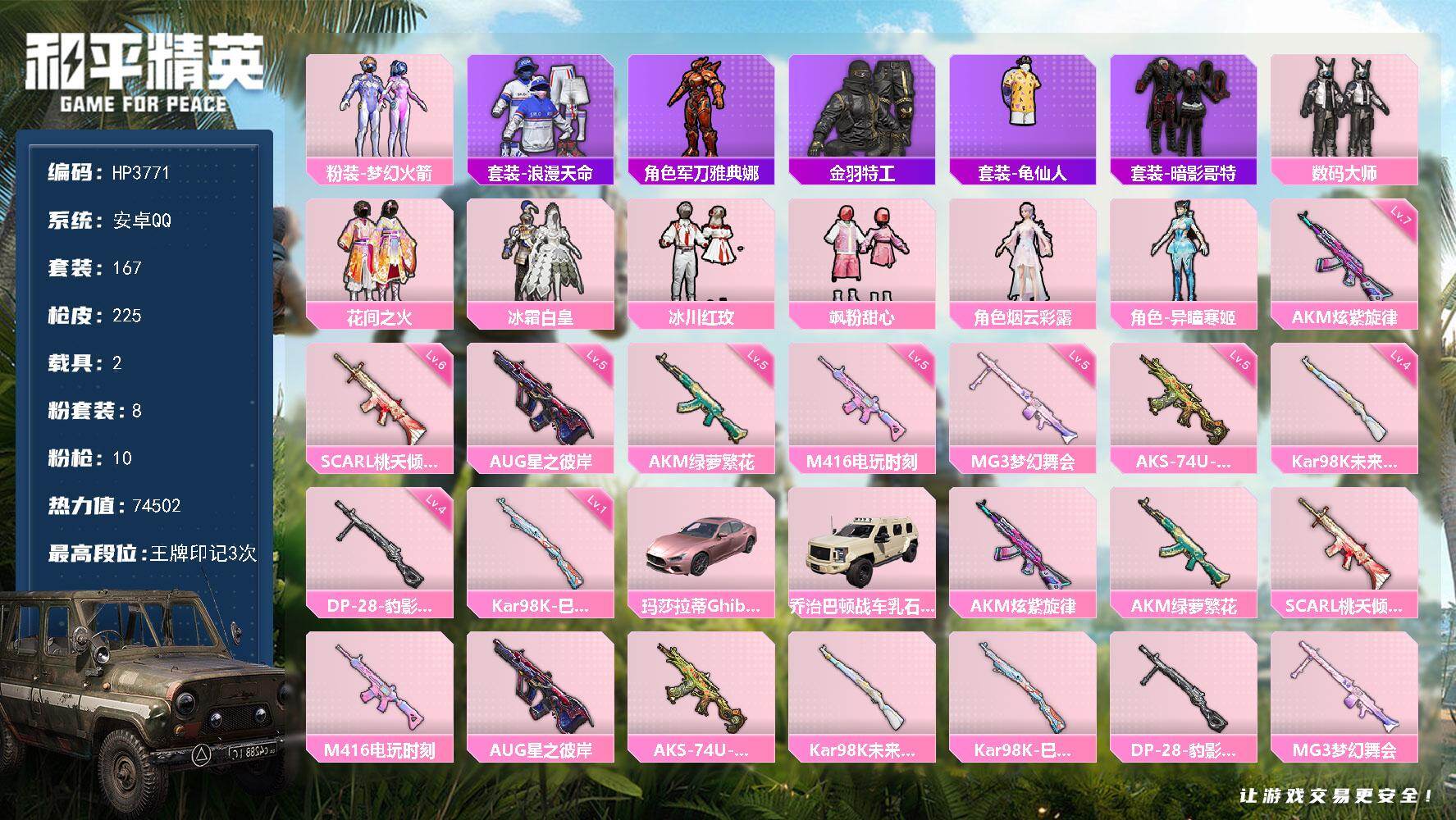 安卓 手Q-8粉装-10特效枪-2载具-4粉色飞行器-74502热力值-3王牌