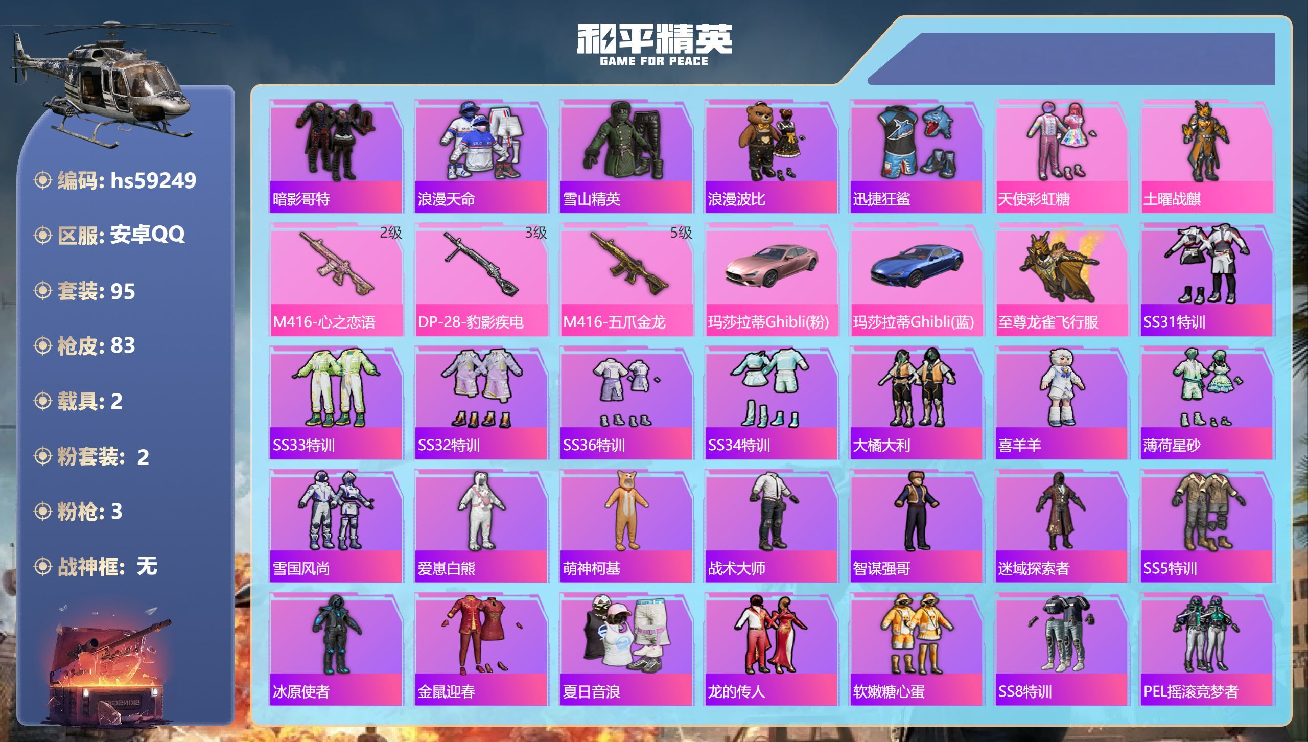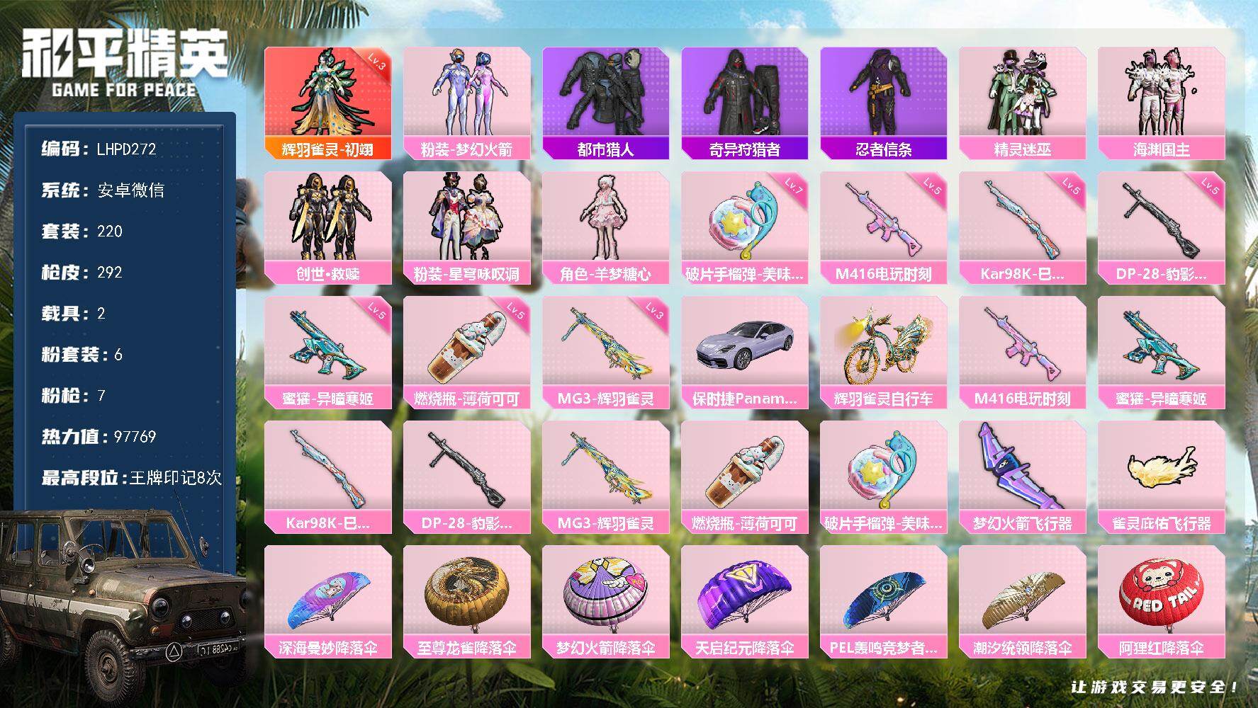 hs59249 安卓手Q-1王牌印记-2粉装-3特效枪-2载具-30199热力值-95套装-83枪皮