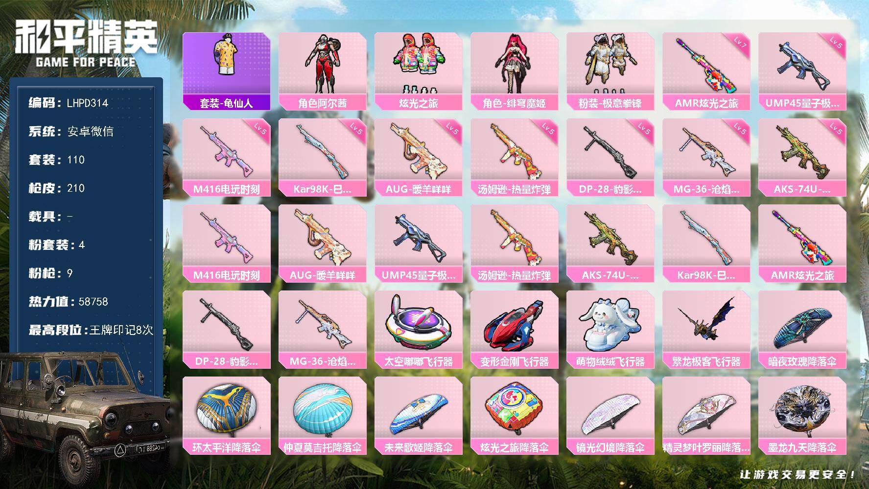 hs60676 安卓v-5王牌印记-6粉装-4特效枪-1载具-42172热力值-110套装-114