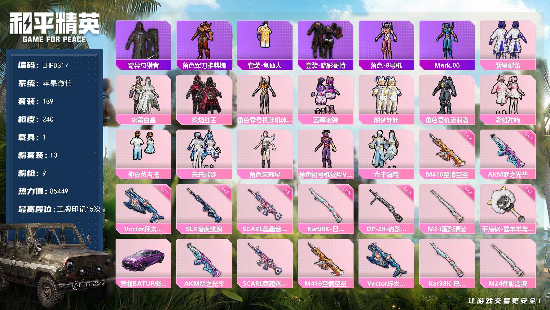 9粉枪 4粉装 3载具 3级图卡盟 带战神框 86423热力值