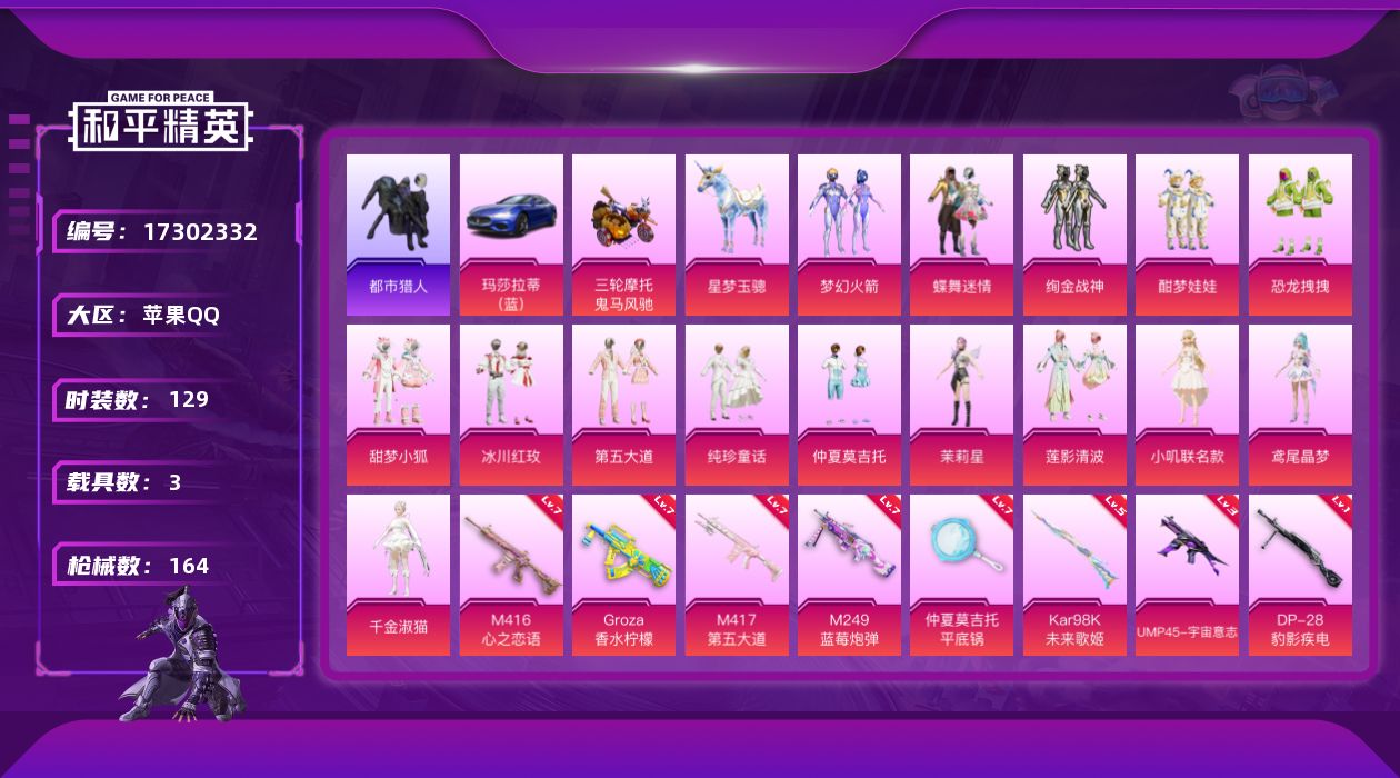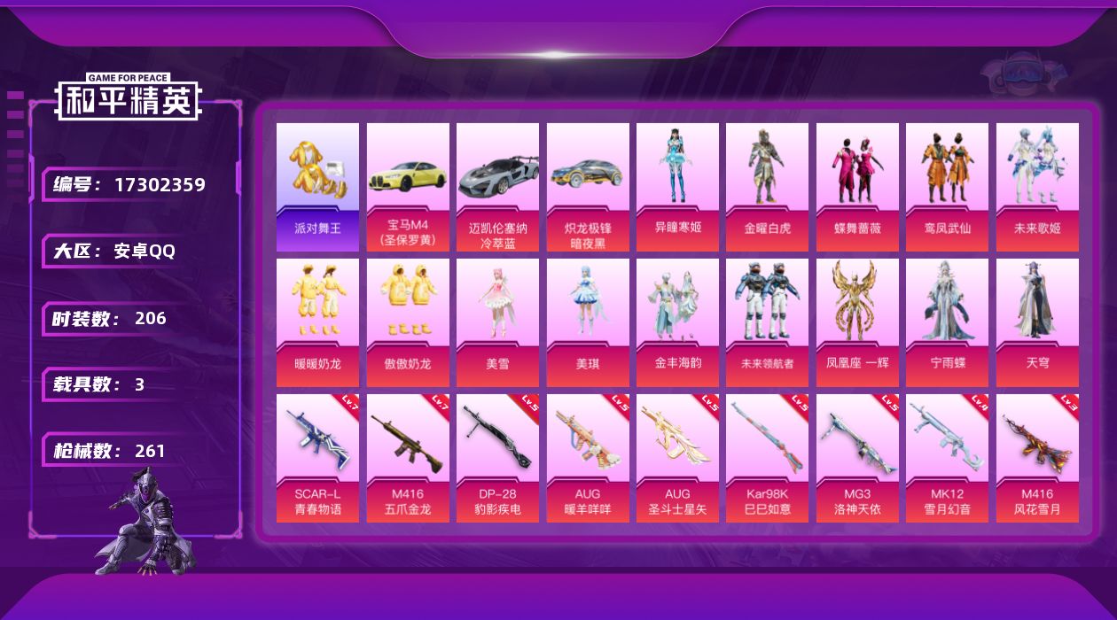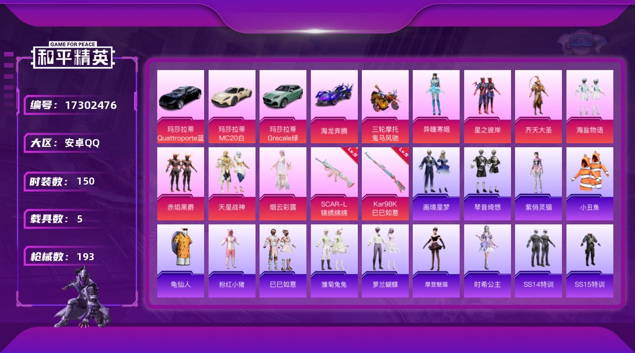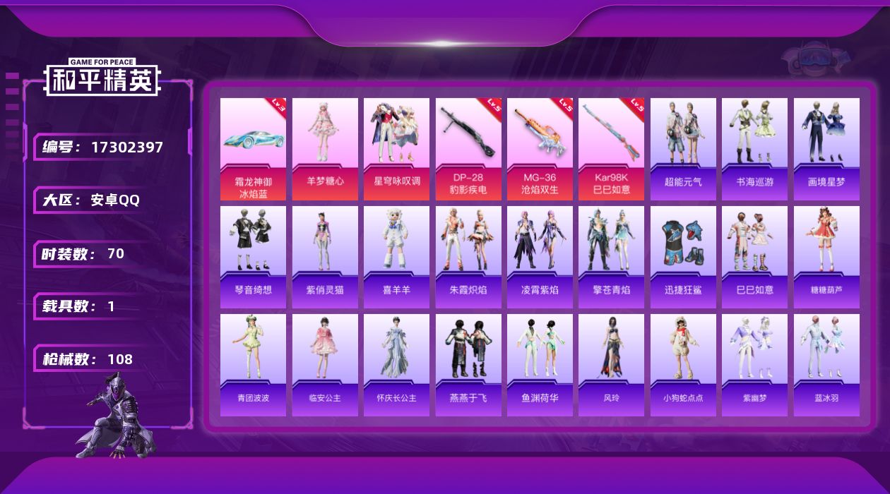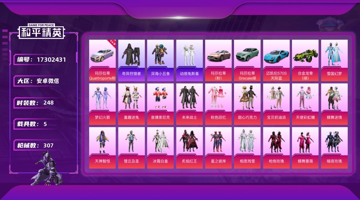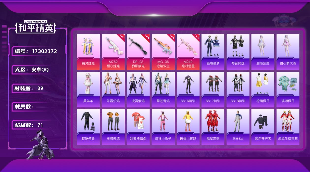 安卓 手Q-1神装-17粉装-13特效枪-3载具-7粉色