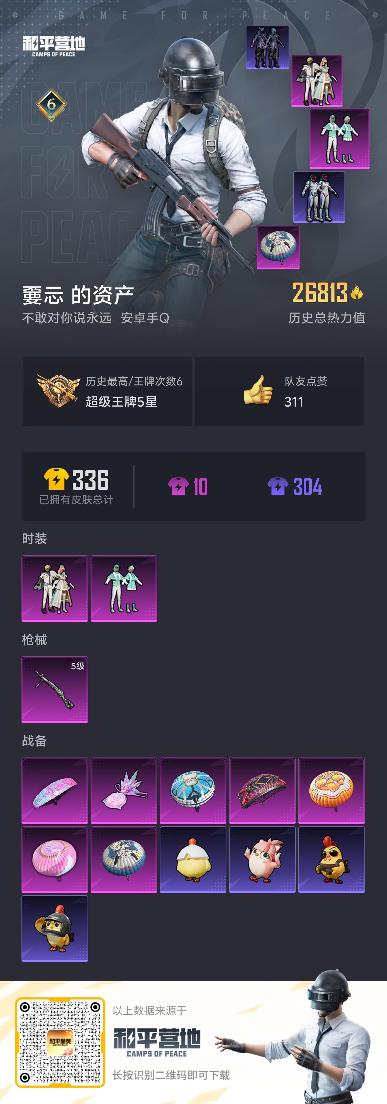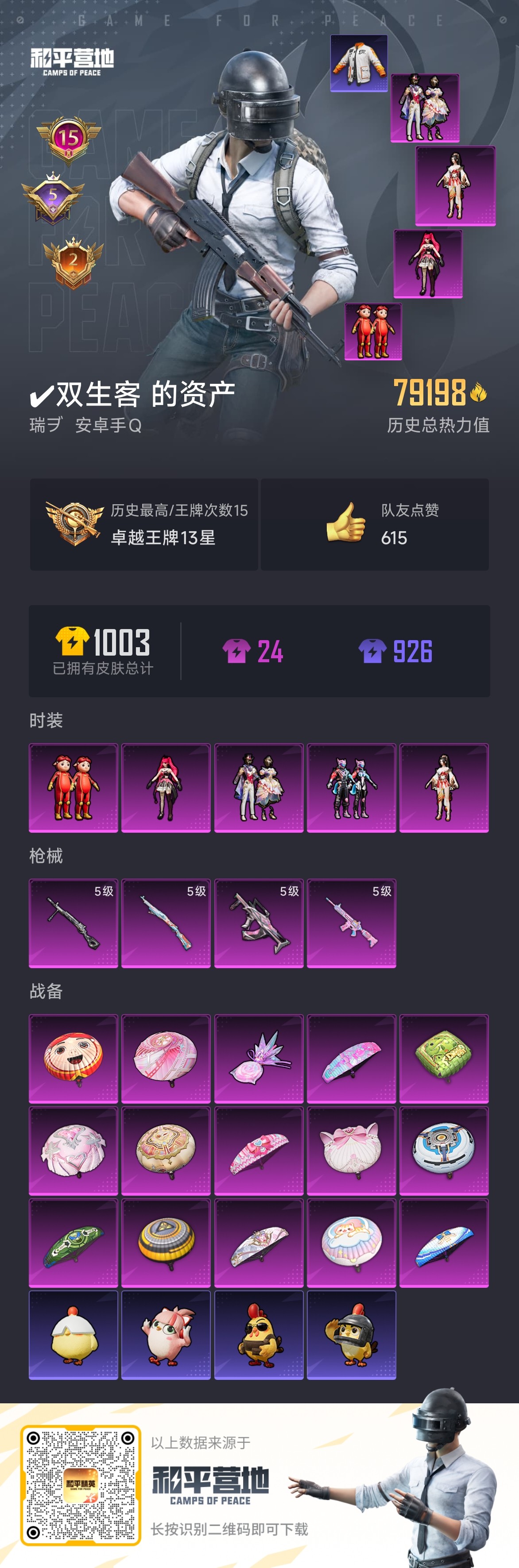 hs59453 安卓手Q-15王牌印记-1红装-6粉装-12特效枪-3载具-87516热力值-189