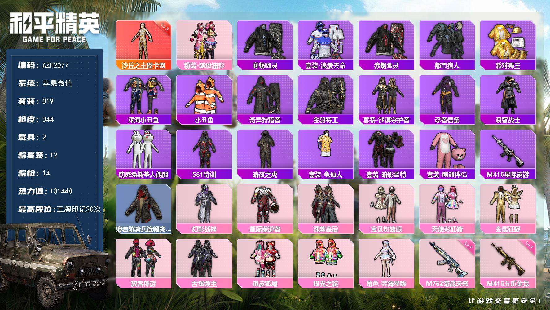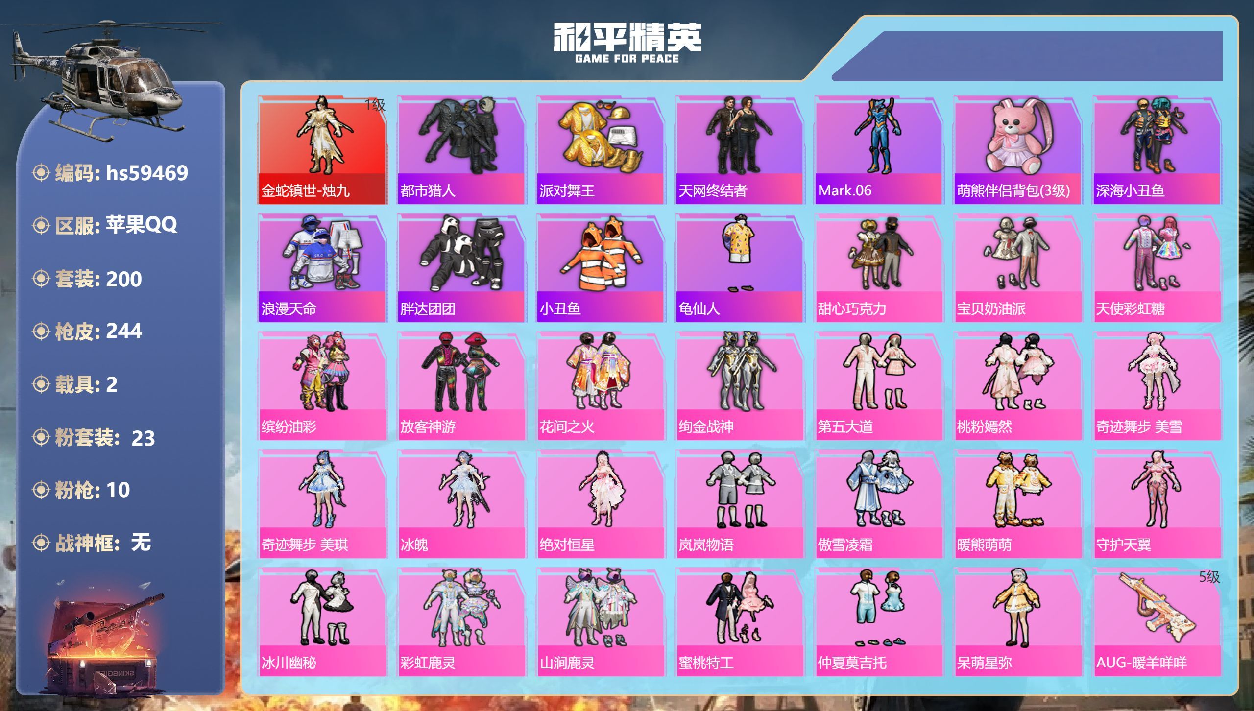 hs59469 苹果手Q-13王牌印记-1红装-23粉装-10特效枪-2载具-87971热力值-20