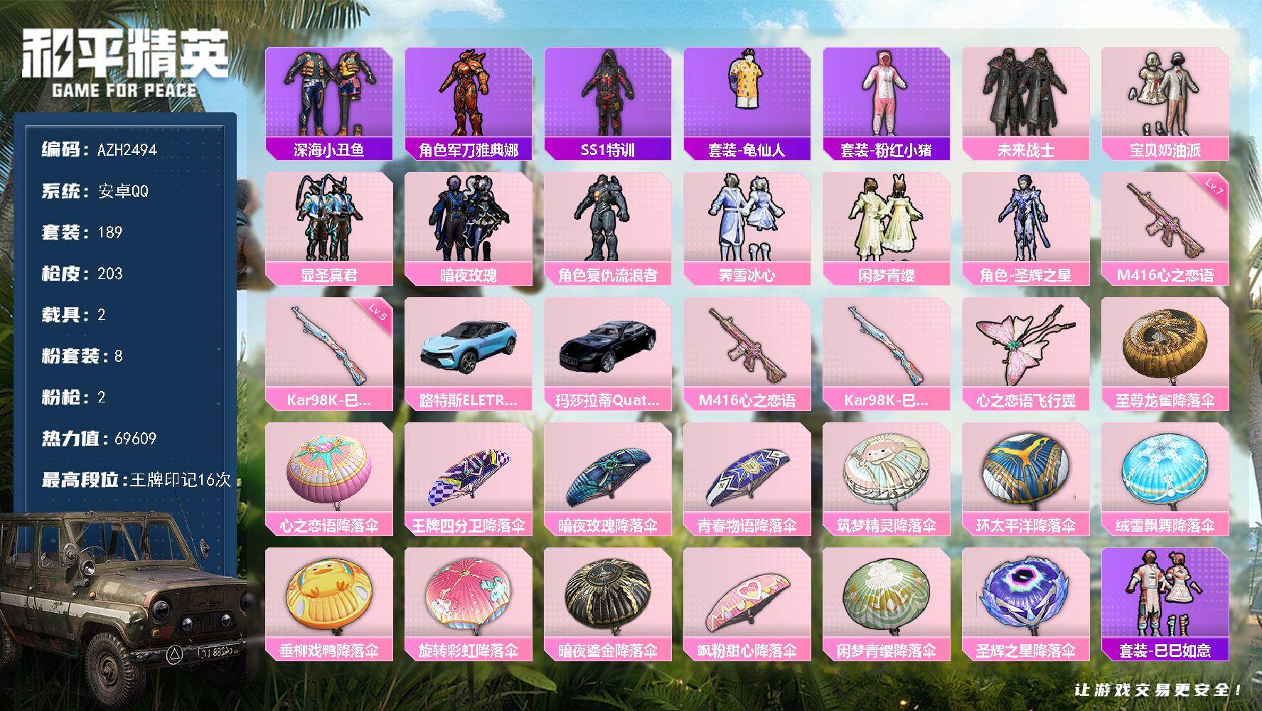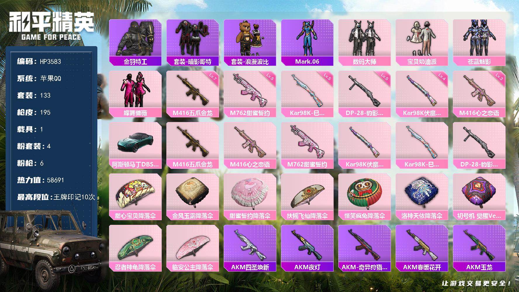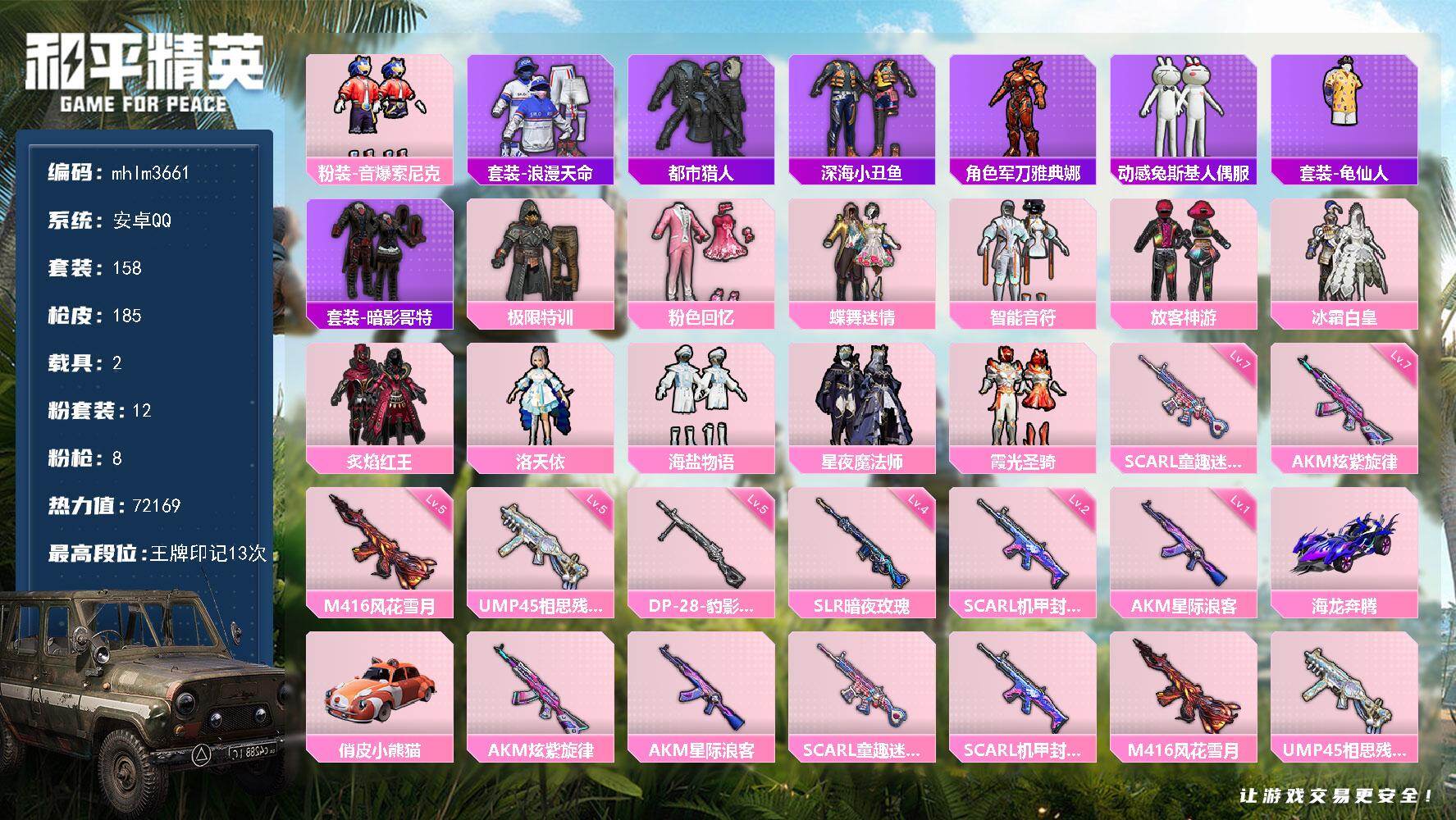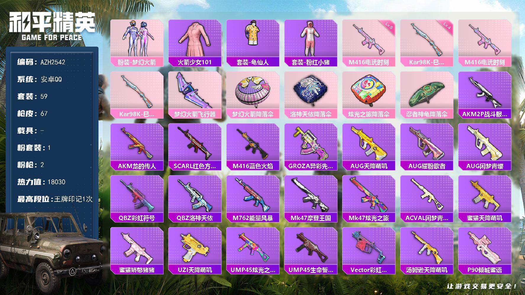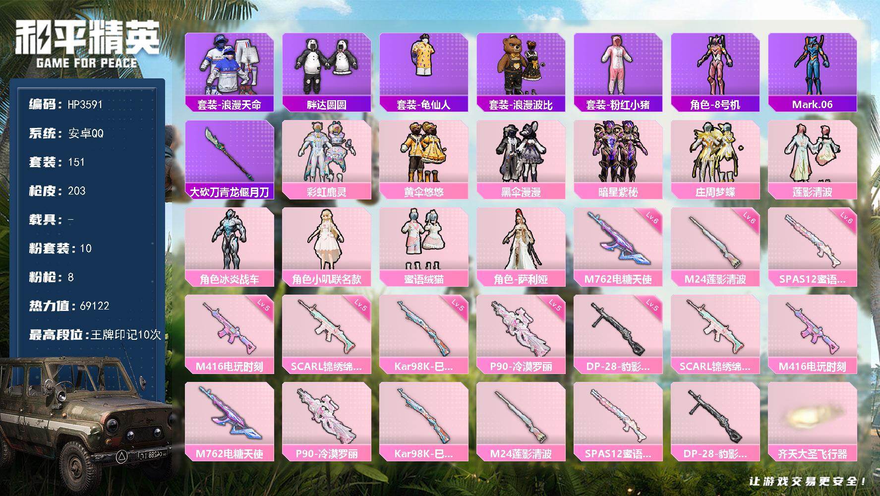 hs59423 安卓手Q-10王牌印记-12粉装-12特效枪-3载具-91027热力值-168套装-