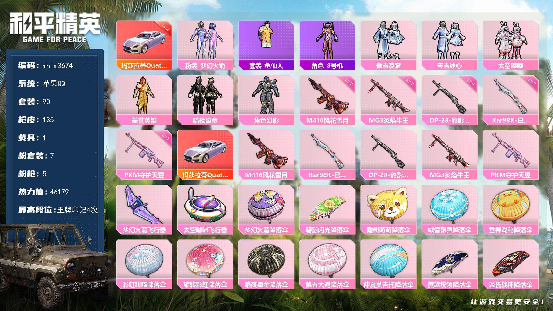 苹果 手Q-4粉装-6特效枪-1载具-0粉色飞行器-58691热力值-10王牌