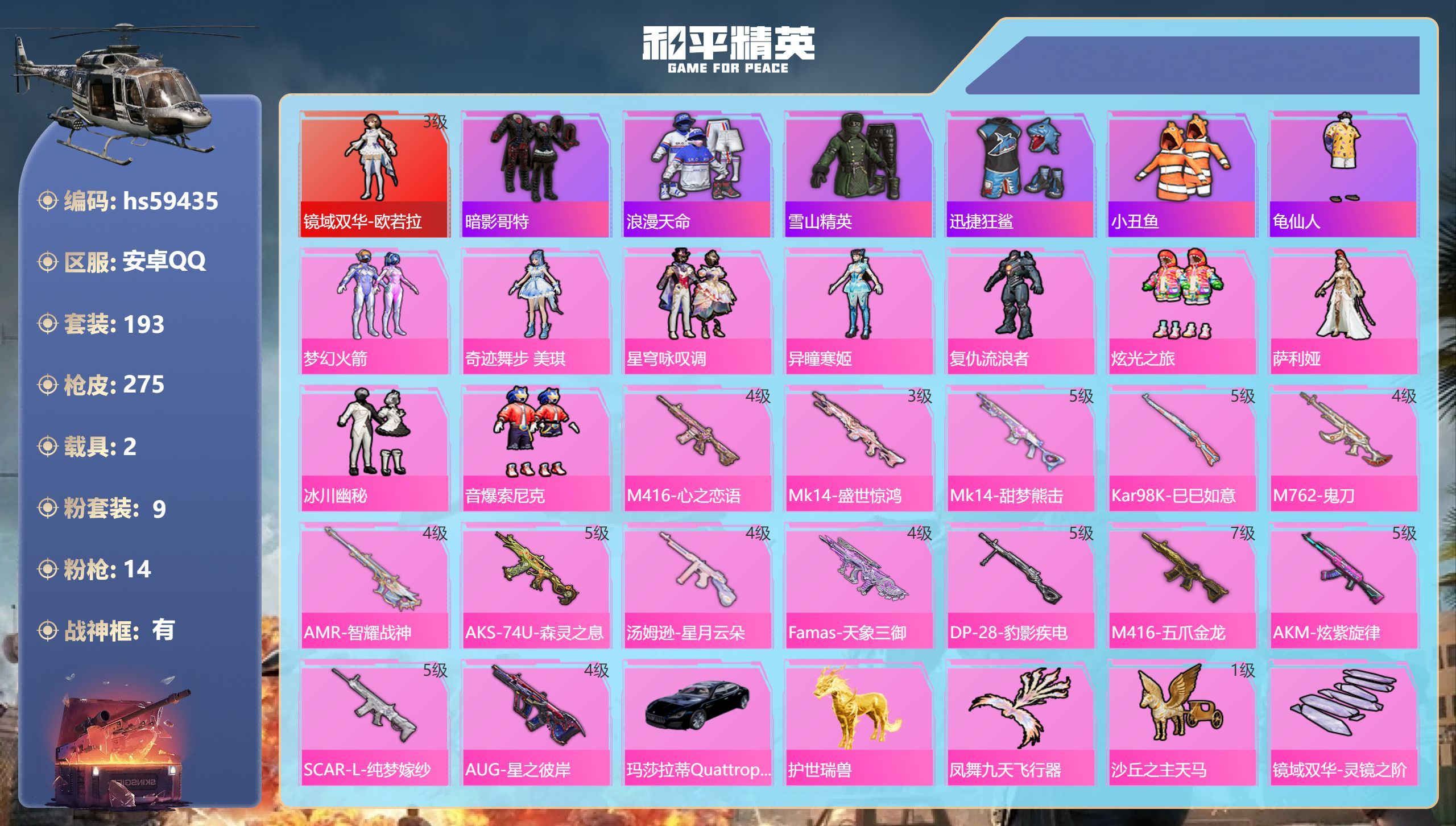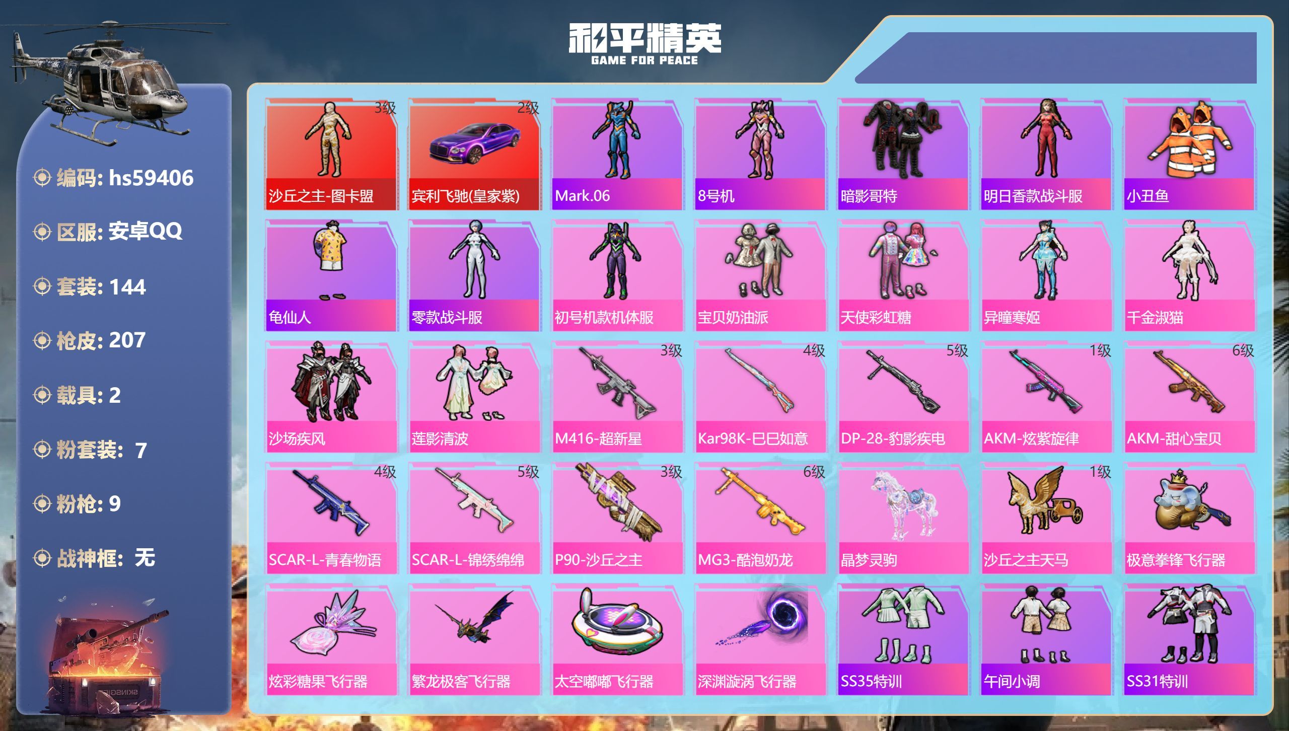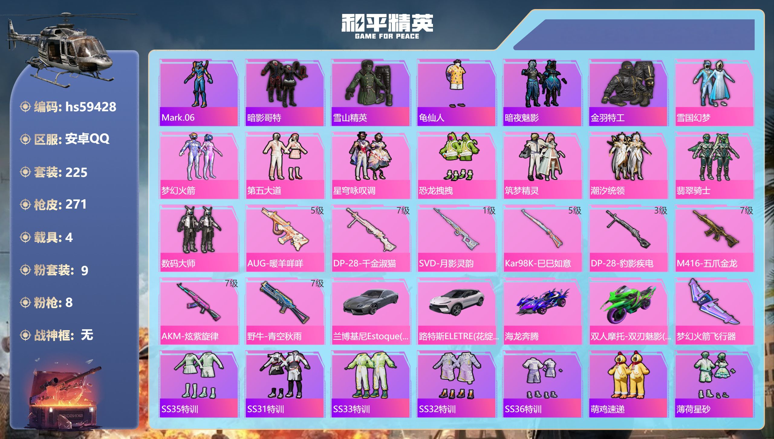 hs59428 安卓手Q-11王牌印记-9粉装-8特效枪-4载具-96204热力值-225套装-27