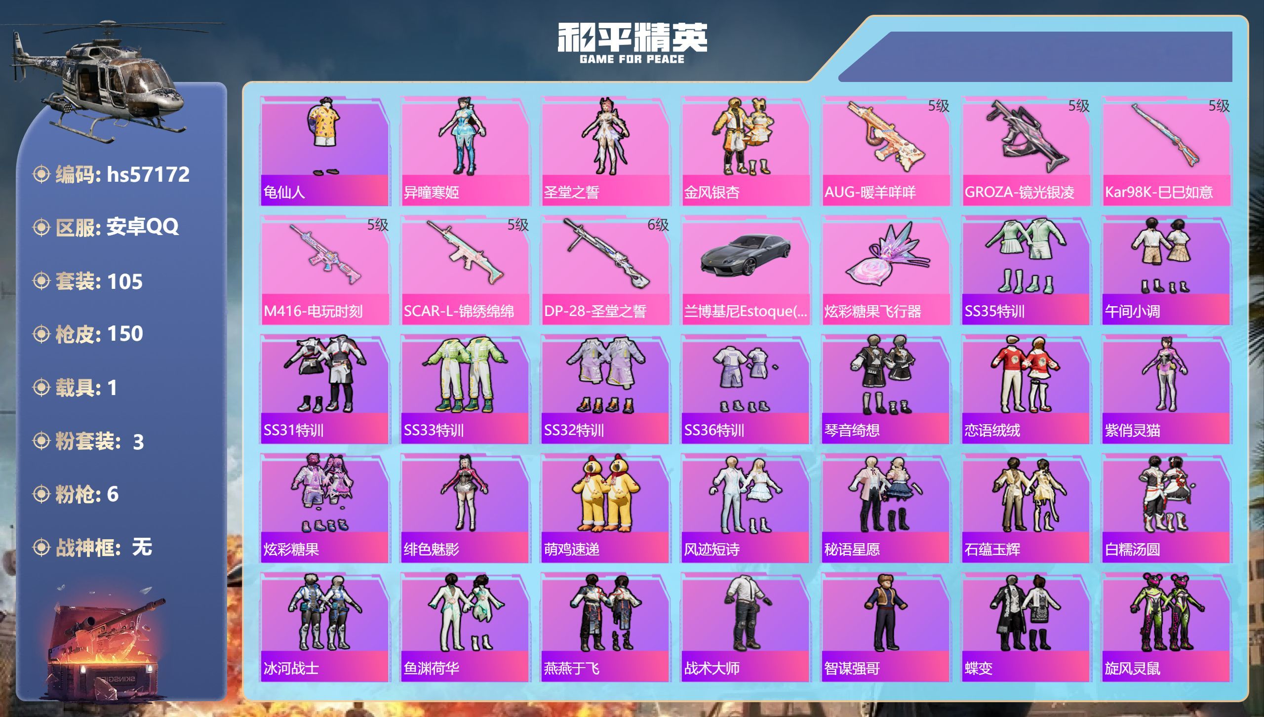 hs57172 安卓手Q-1王牌印记-3粉装-6特效枪-1载具-43430热力值-105套装-150