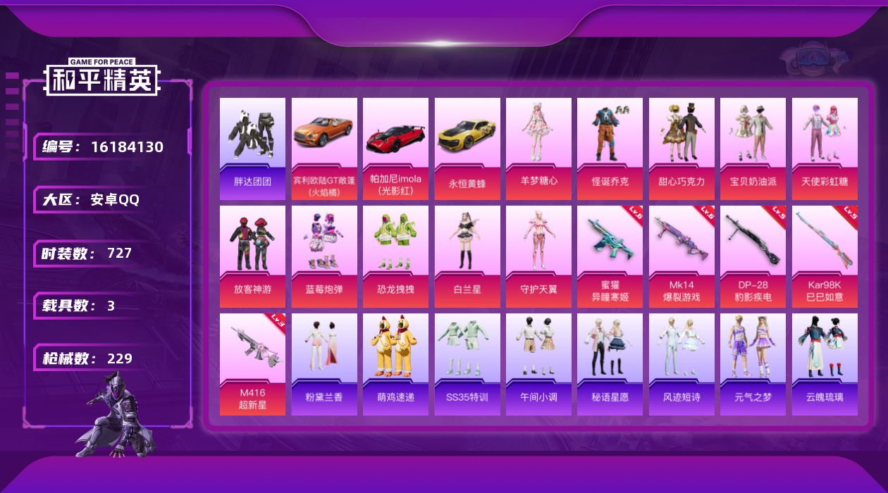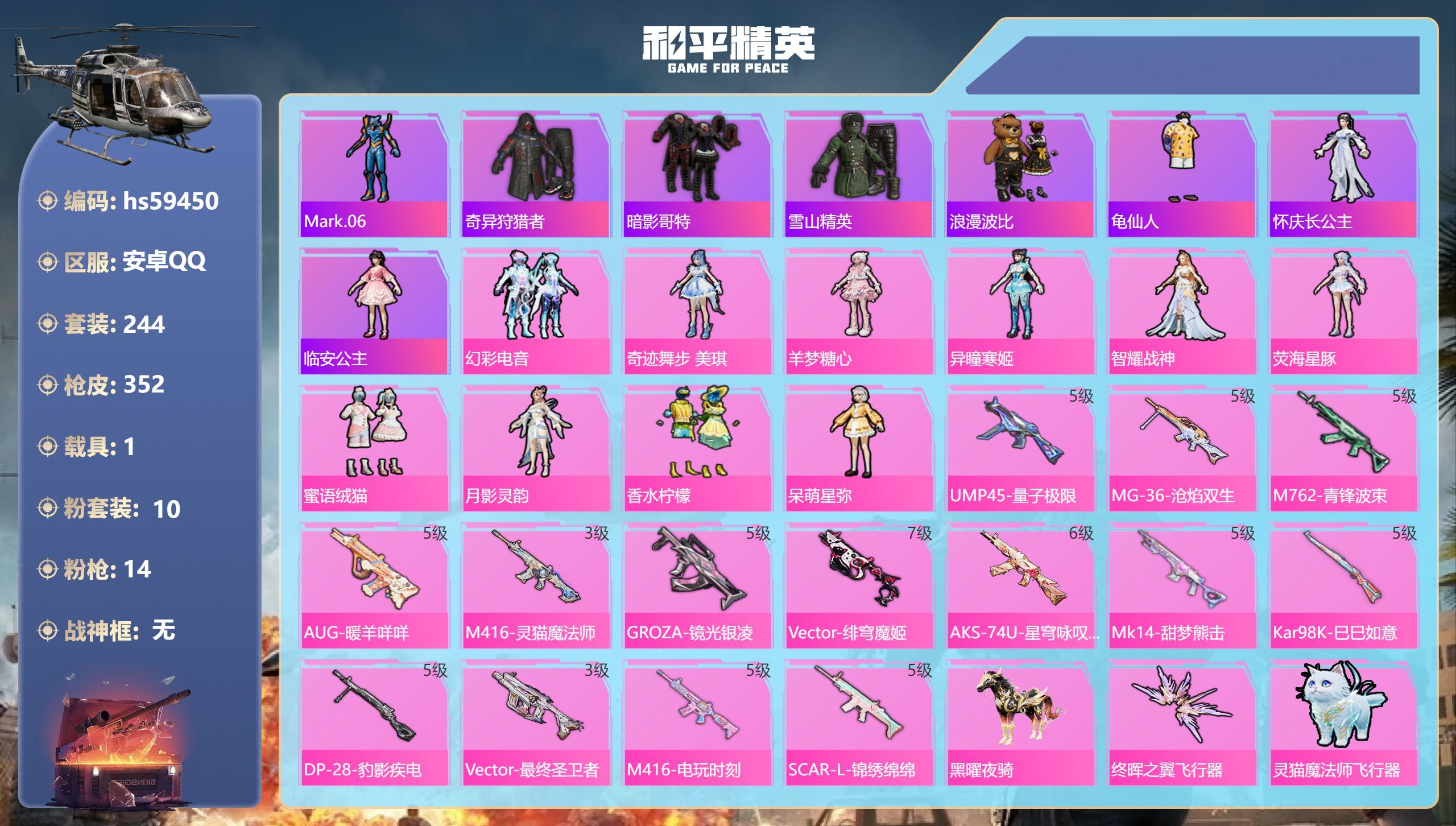 hs59450 安卓手Q-16王牌印记-10粉装-14特效枪-1载具-118815热力值-244套装