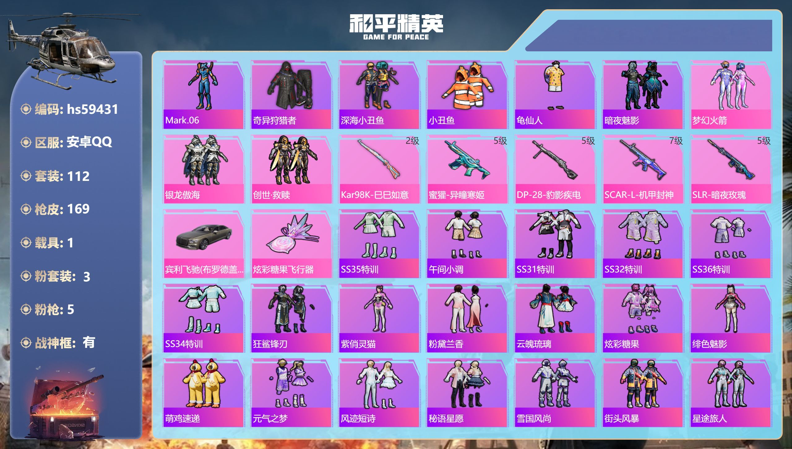 hs59431 安卓手Q-6王牌印记-有战神框-3粉装-5特效枪-1载具-48997热力值-112套