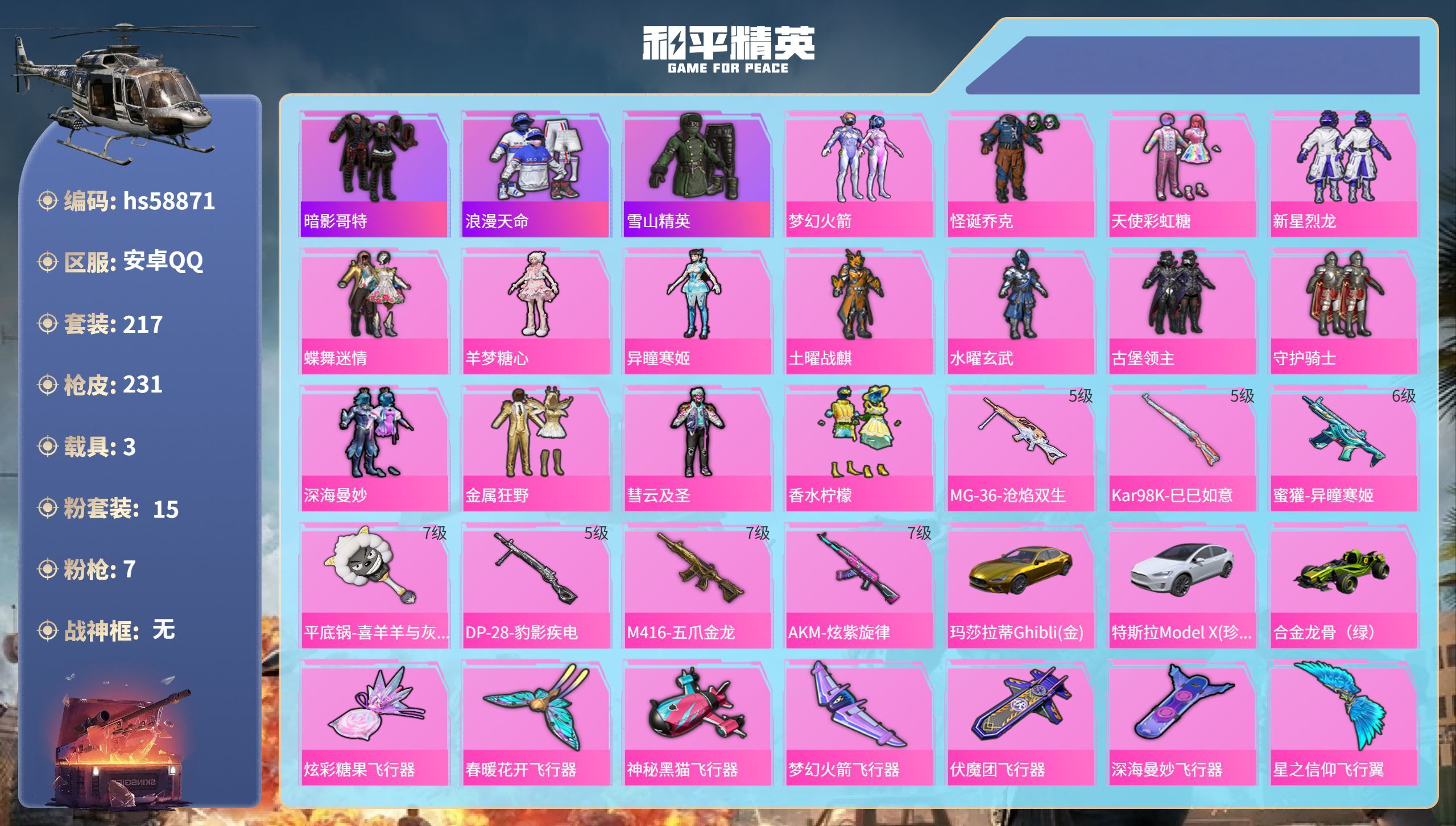 hs58871 安卓手Q-15王牌印记-15粉装-7特效枪-3载具-98895热力值-217套装-2