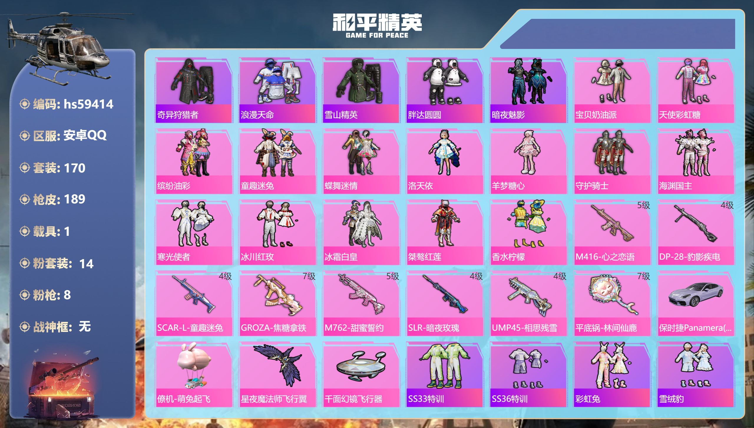hs59414 安卓手Q-13王牌印记-14粉装-8特效枪-1载具-72337热力值-170套装-1