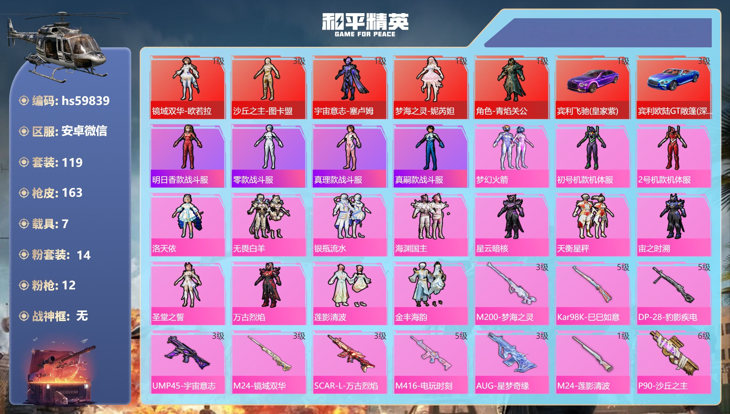 hs59839 安卓微-3王牌印记-5红装-14粉装-12特效枪-7载具-82323热力值-119