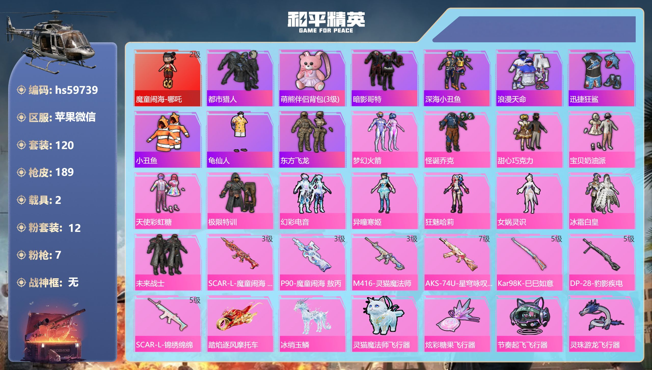 hs59488 苹果手Q-19王牌印记-9粉装-15特效枪-1载具-97449热力值-212套装-3