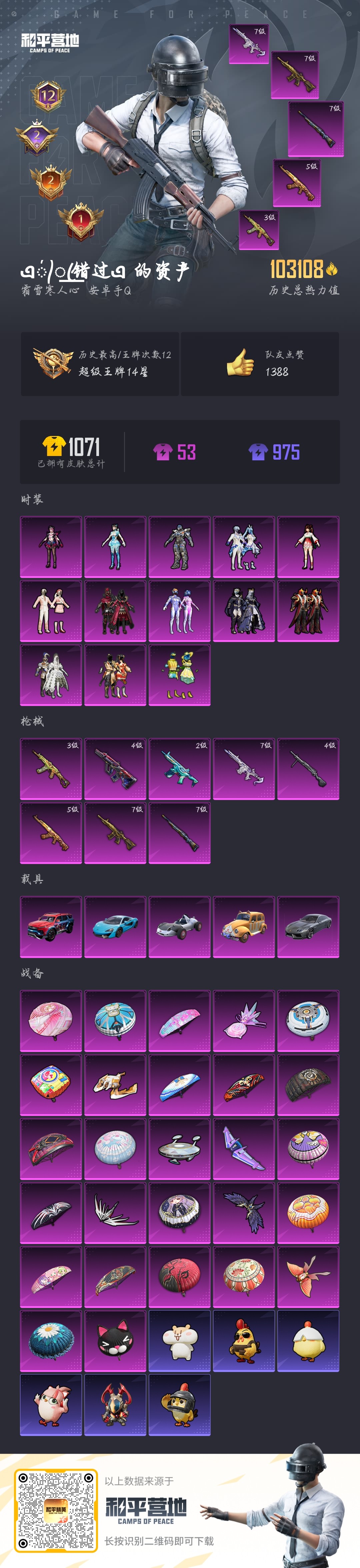 安卓Q 13粉装 8粉枪 5载具 12王牌印记 103108热力值 王者和平一体号,王者贵族7