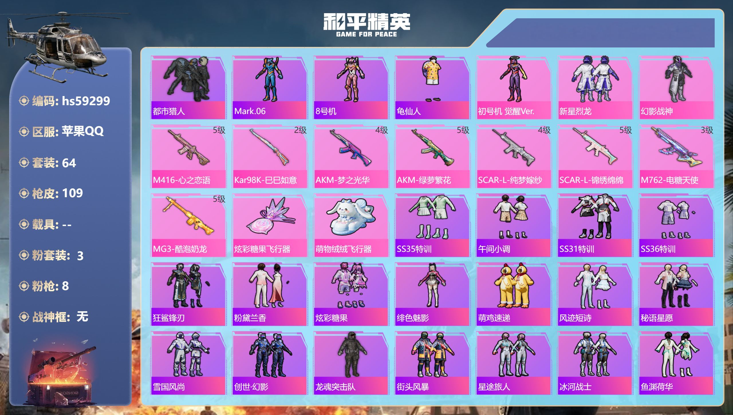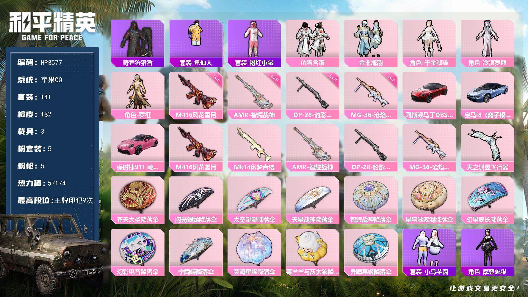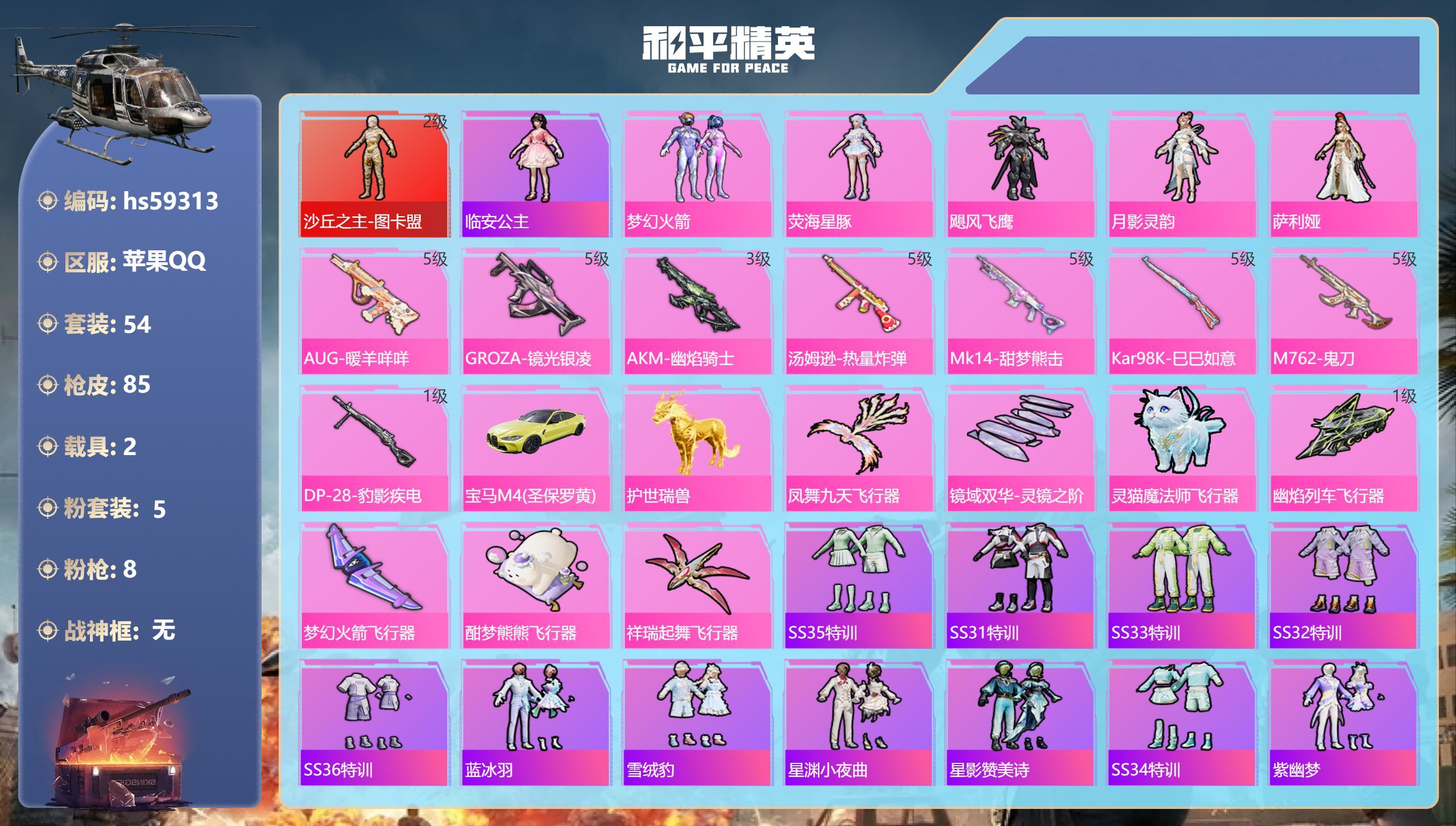 hs59313 苹果手Q-3王牌印记-1红装-5粉装-8特效枪-2载具-31236热力值-54套装-