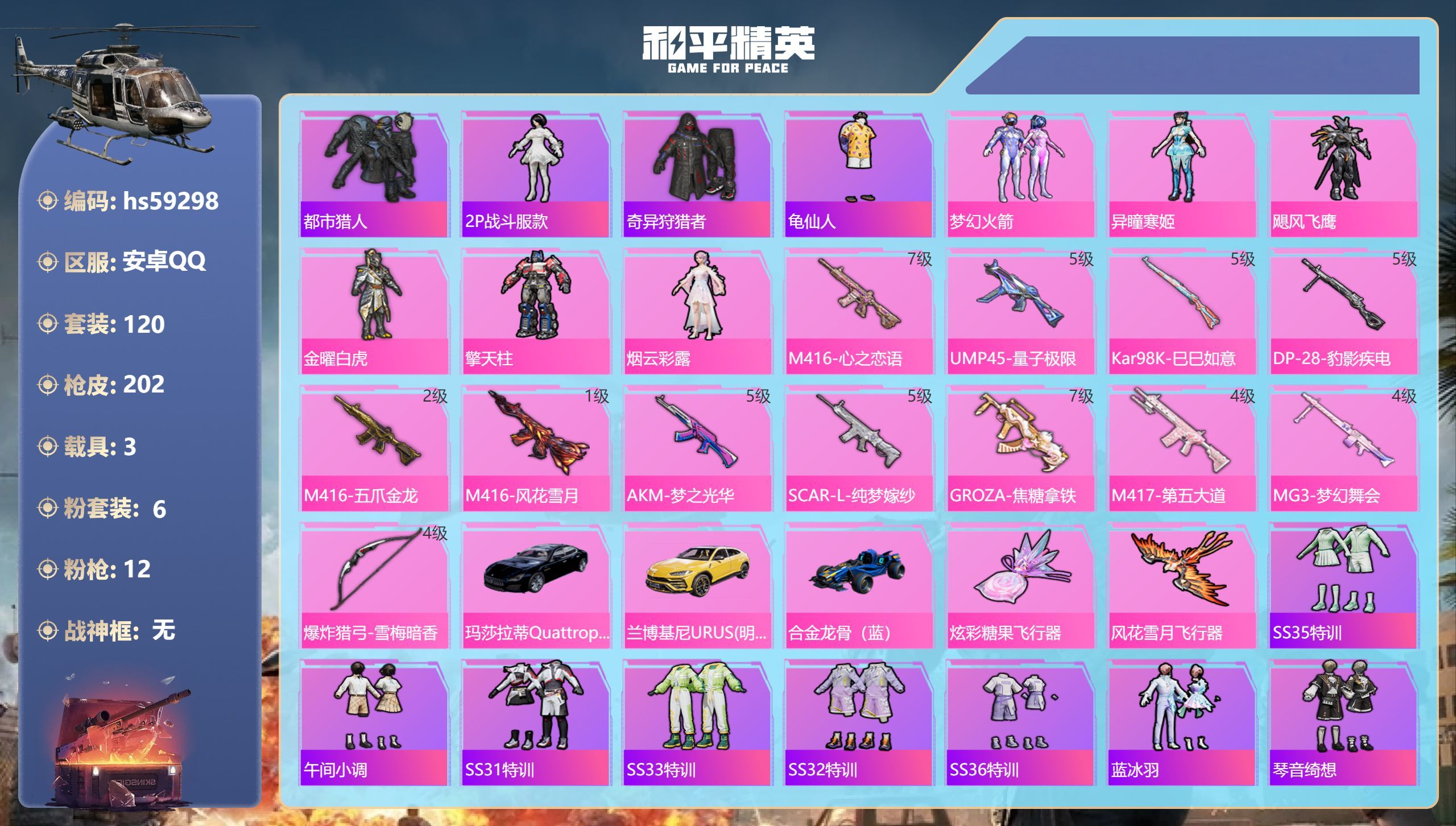 hs59298 安卓手Q-8王牌印记-6粉装-12特效枪-3载具-61417热力值-120套装-20