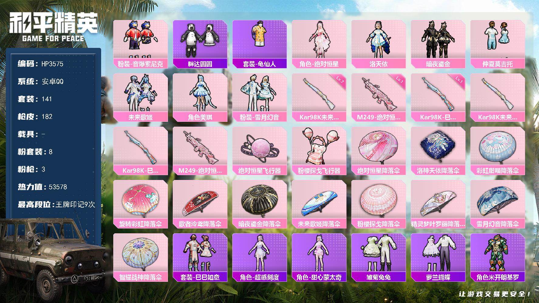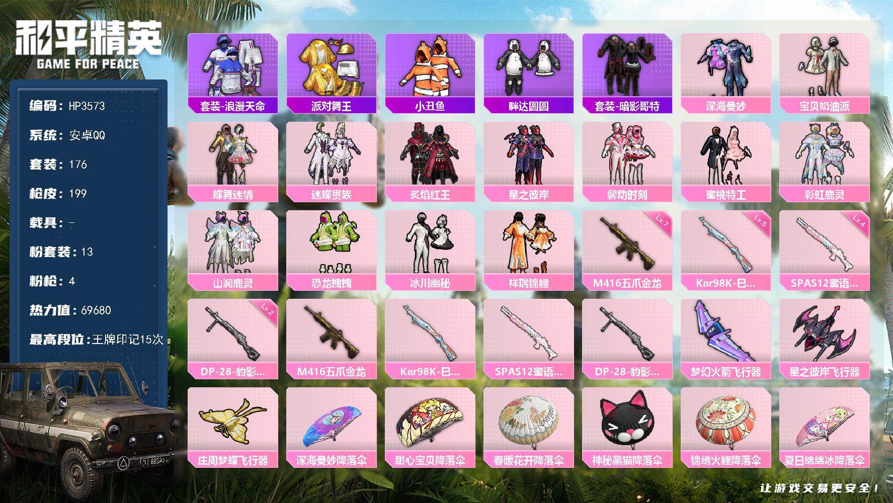 hs59338 安卓手Q-13王牌印记-15粉装-11特效枪-3载具-91990热力值-189套装-