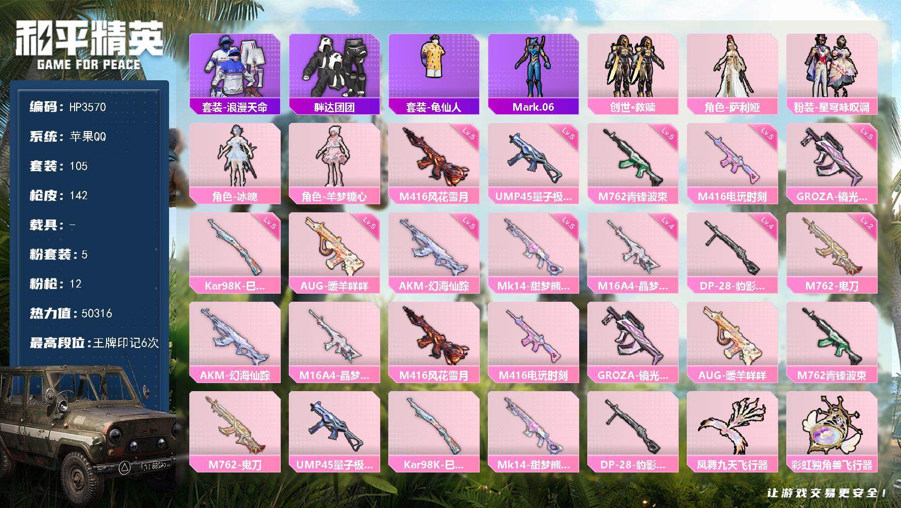苹果 手Q-5粉装-12特效枪-0载具-4粉色飞行器-50316热力值-6王牌