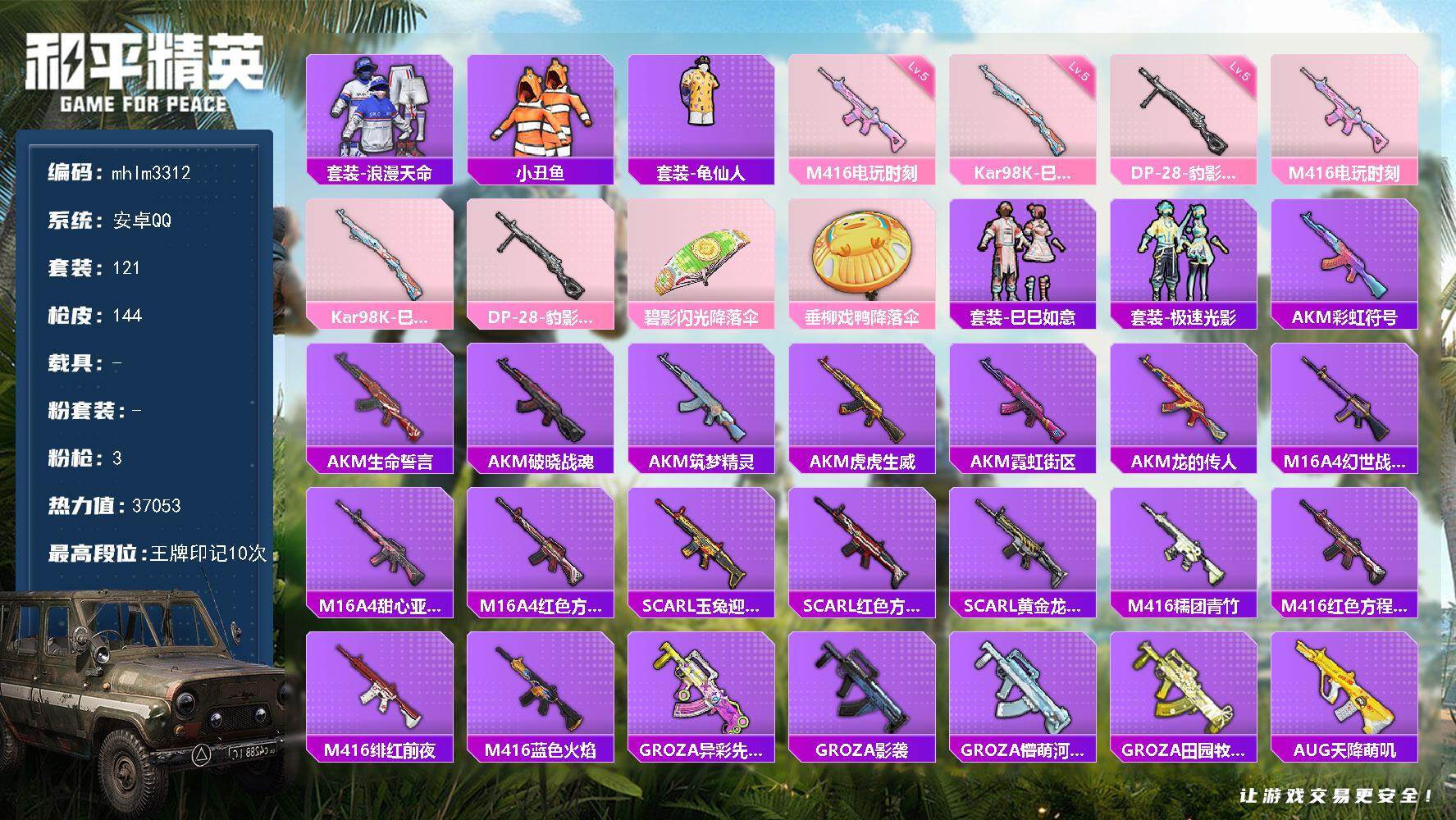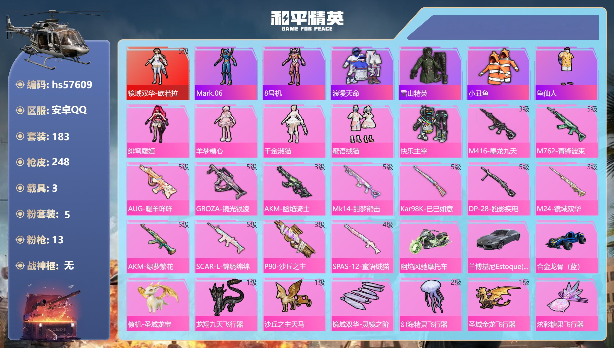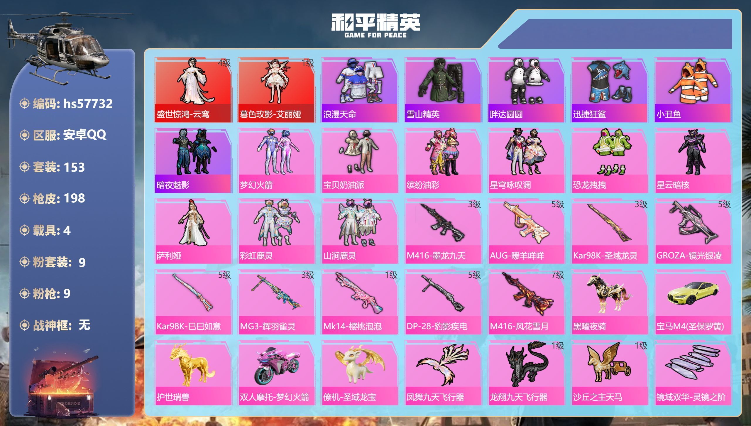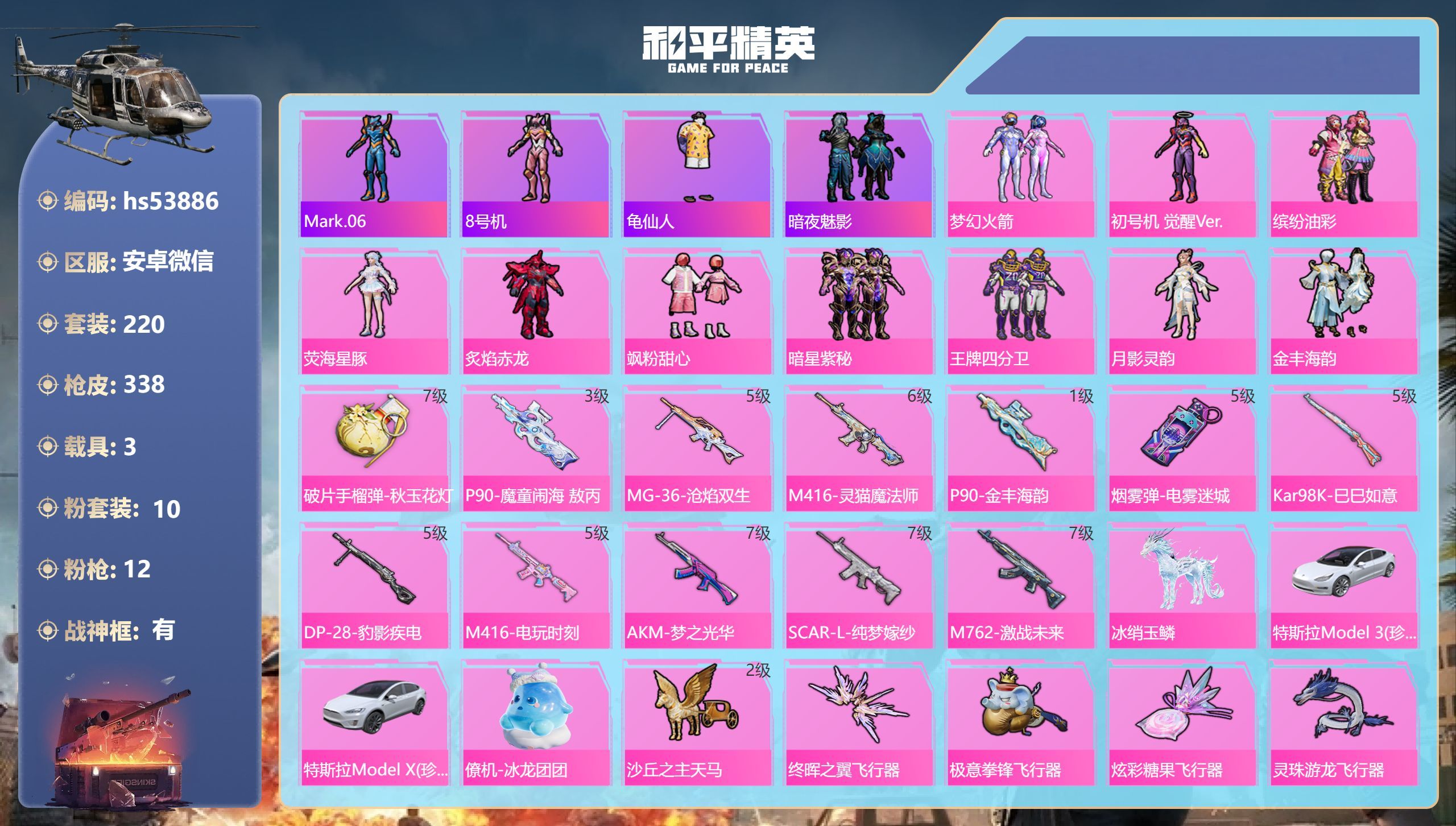 hs53886 安卓v-32王牌印记-有战神框-10粉装-12特效枪-3载具-113499热力值-