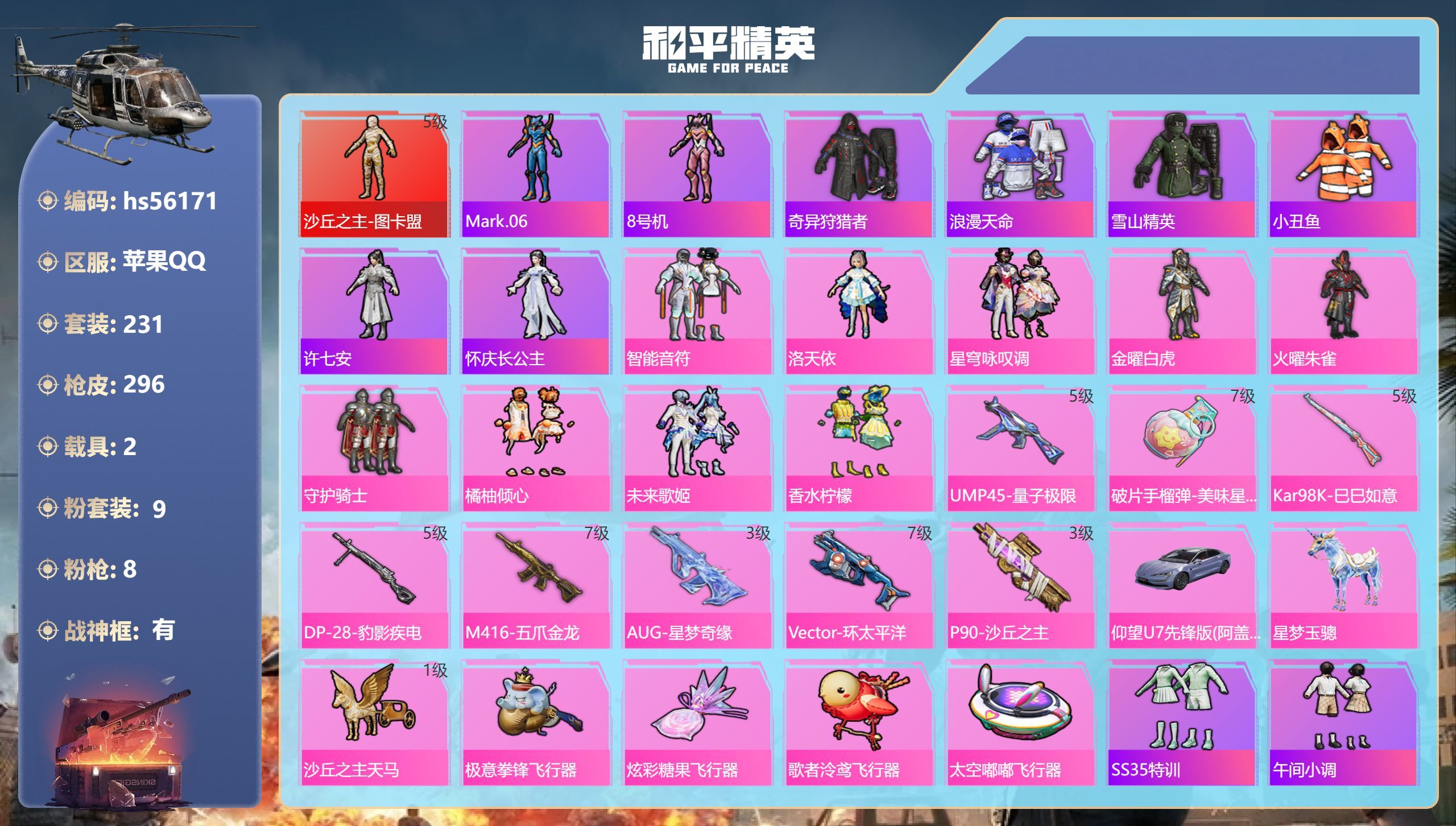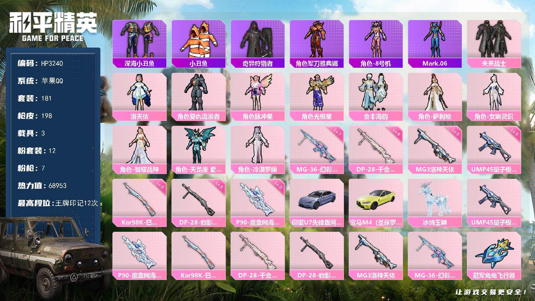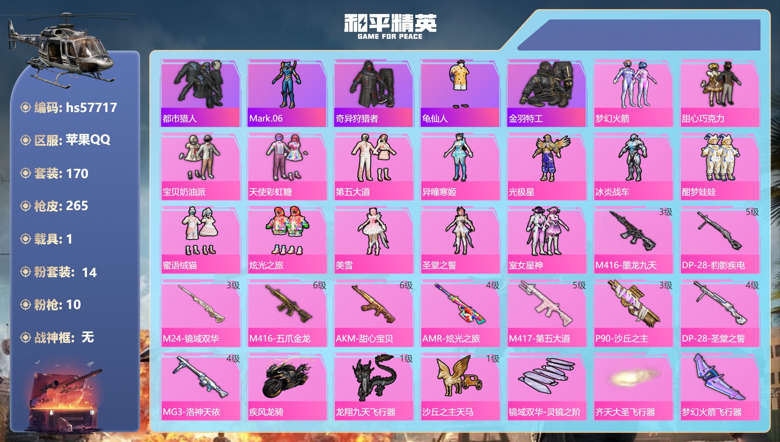 hs57717 苹果手Q-12王牌印记-14粉装-10特效枪-1载具-83731热力值-170套装-