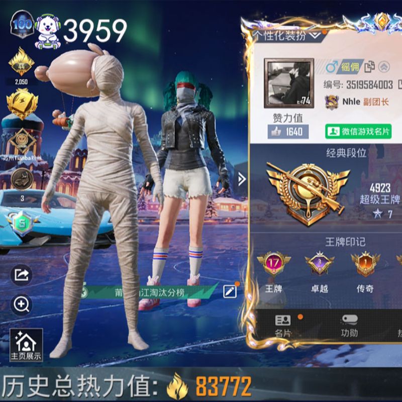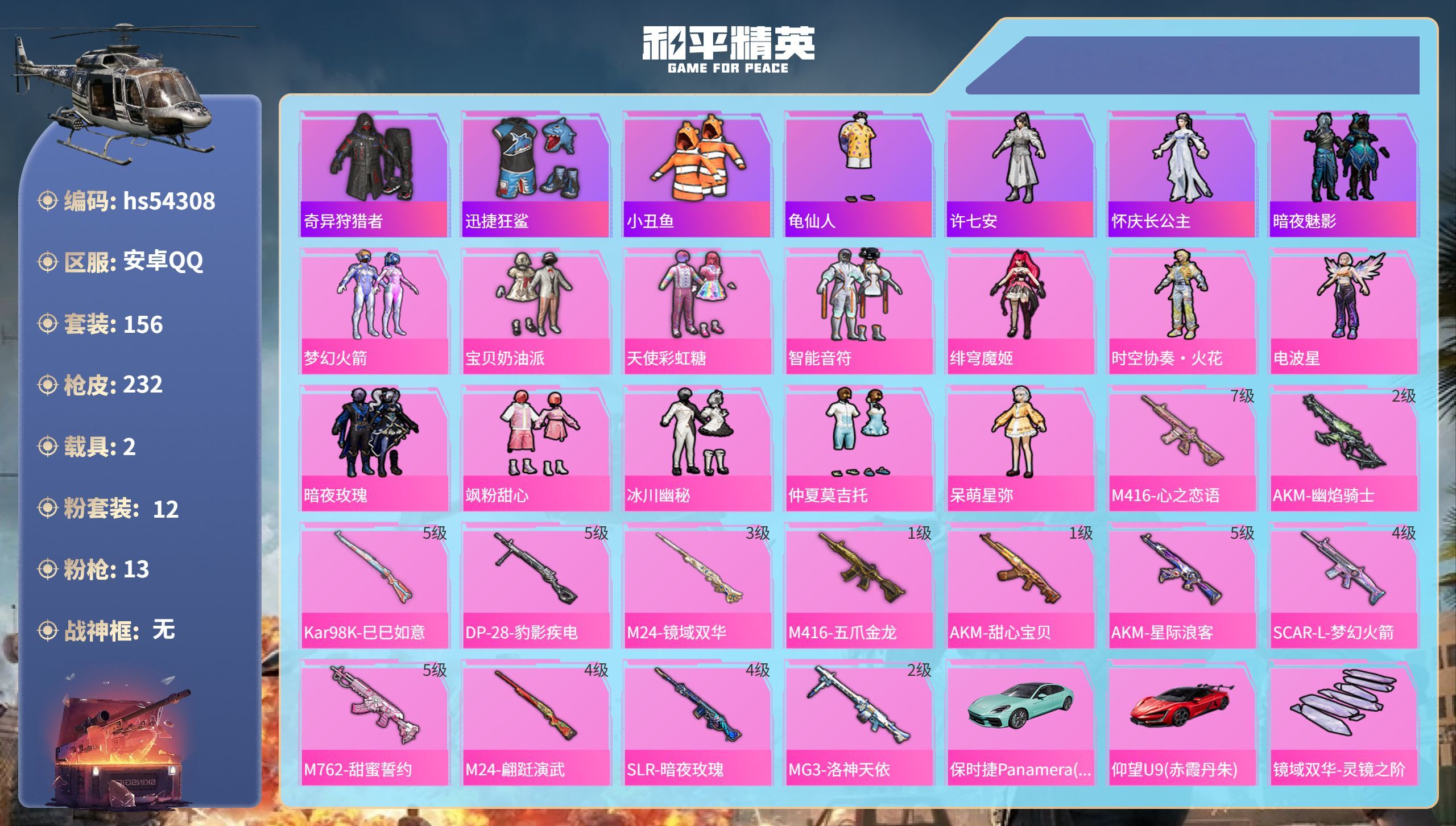 hs54308 安卓手Q-13王牌印记-12粉装-13特效枪-2载具-83214热力值-156套装-