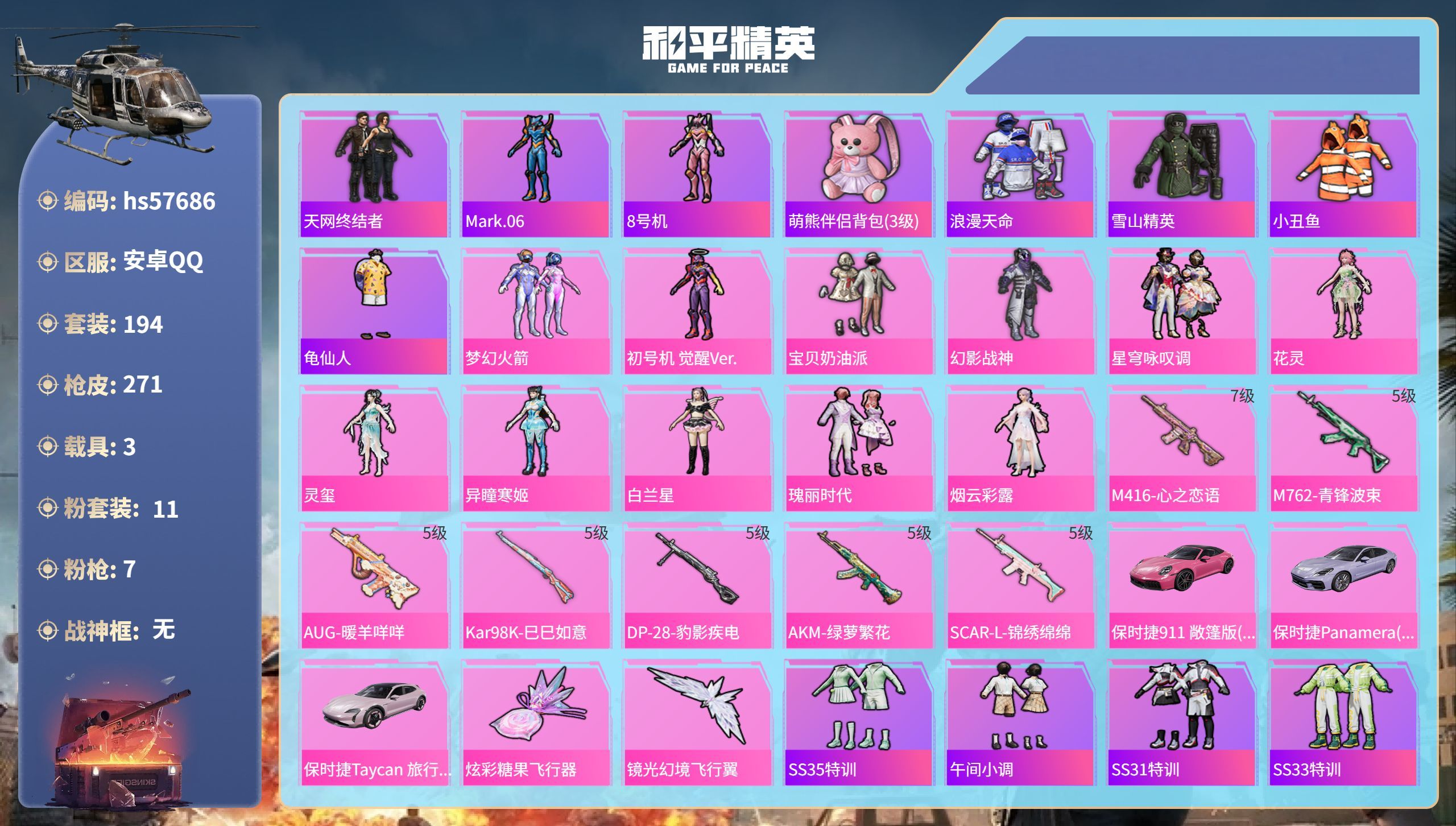 hs57686 安卓手Q-18王牌印记-11粉装-7特效枪-3载具-83818热力值-194套装-2