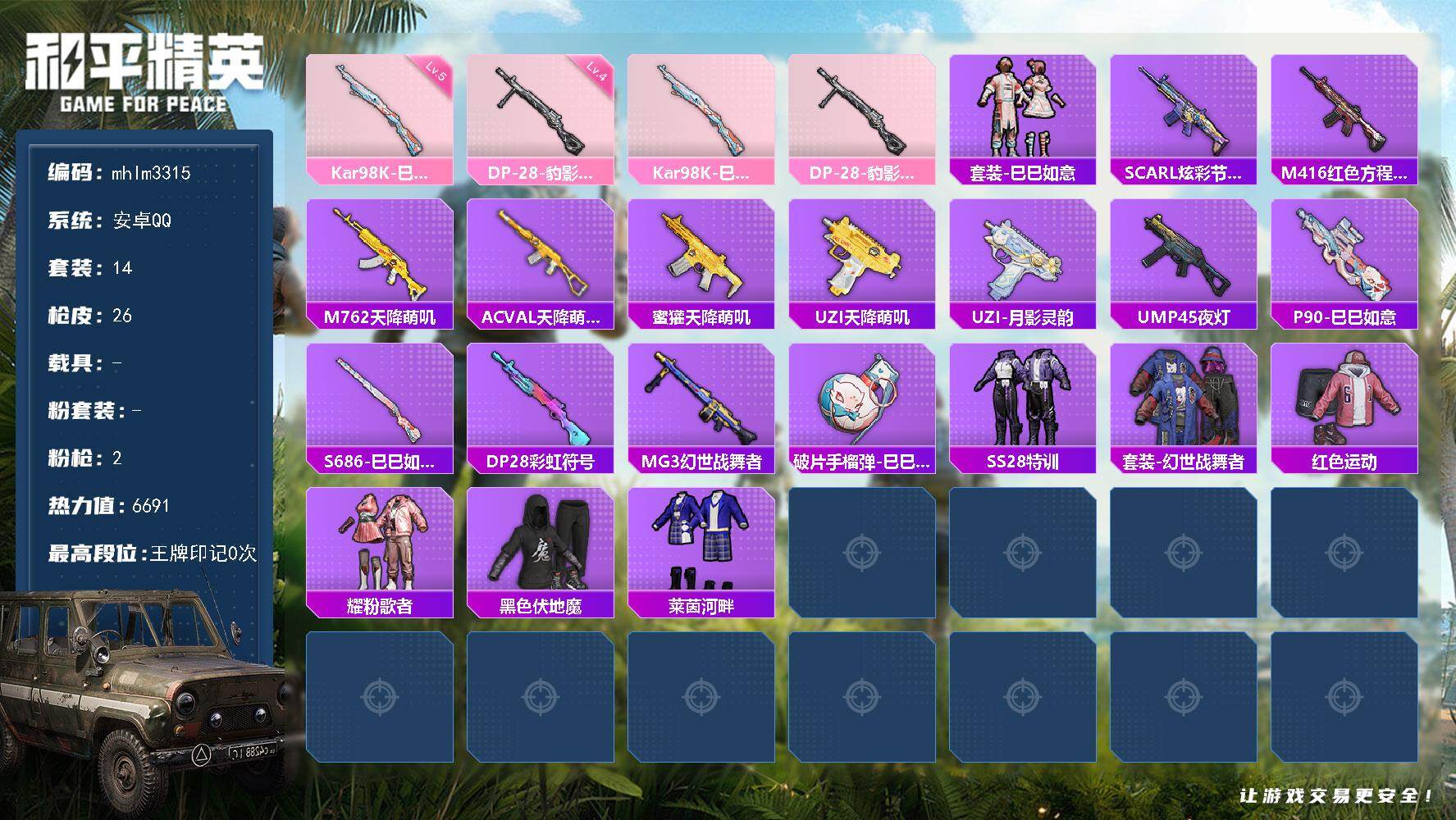 hs54667 安卓手Q-3王牌印记-3粉装-9特效枪-29602热力值-49套装-101枪皮【3粉