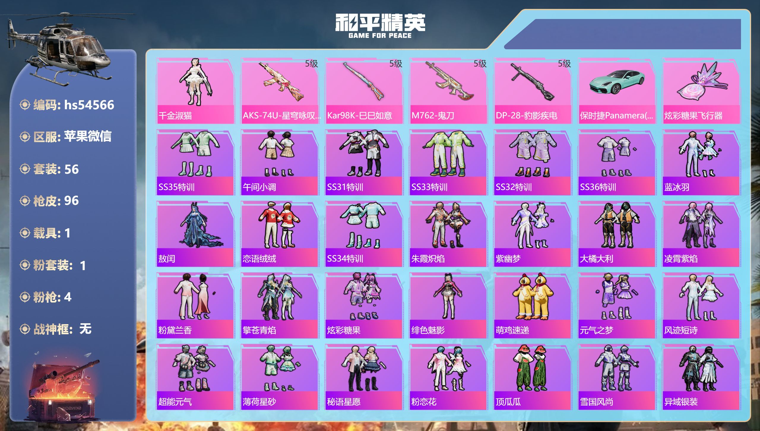 hs54566 苹果v-4王牌印记-1粉装-4特效枪-1载具-热力值-56套装-96枪皮