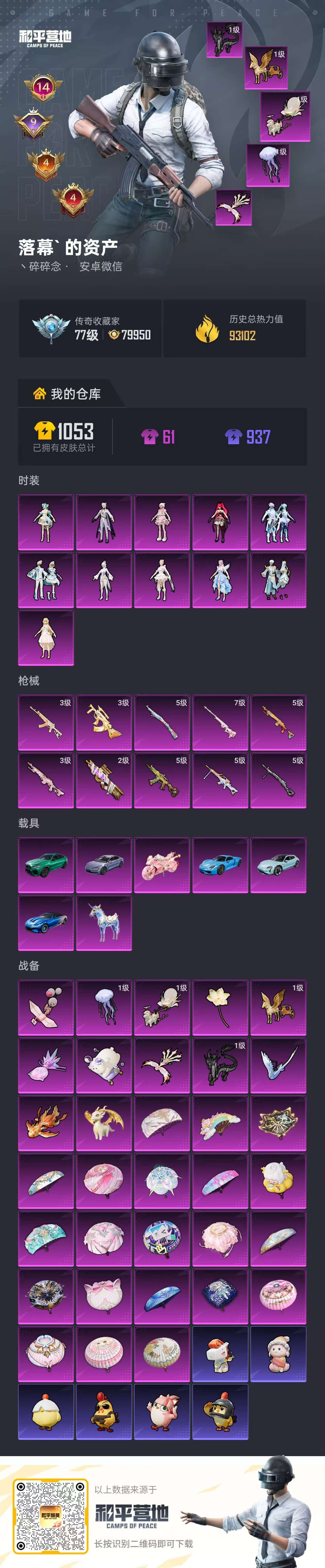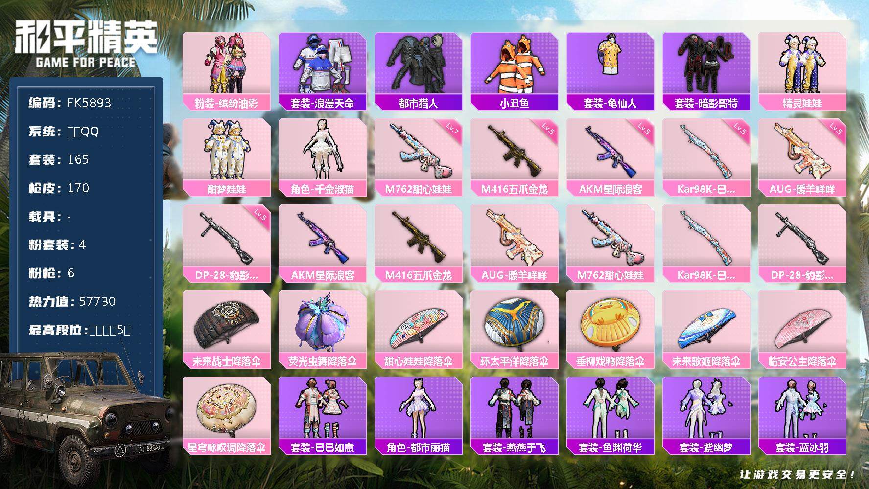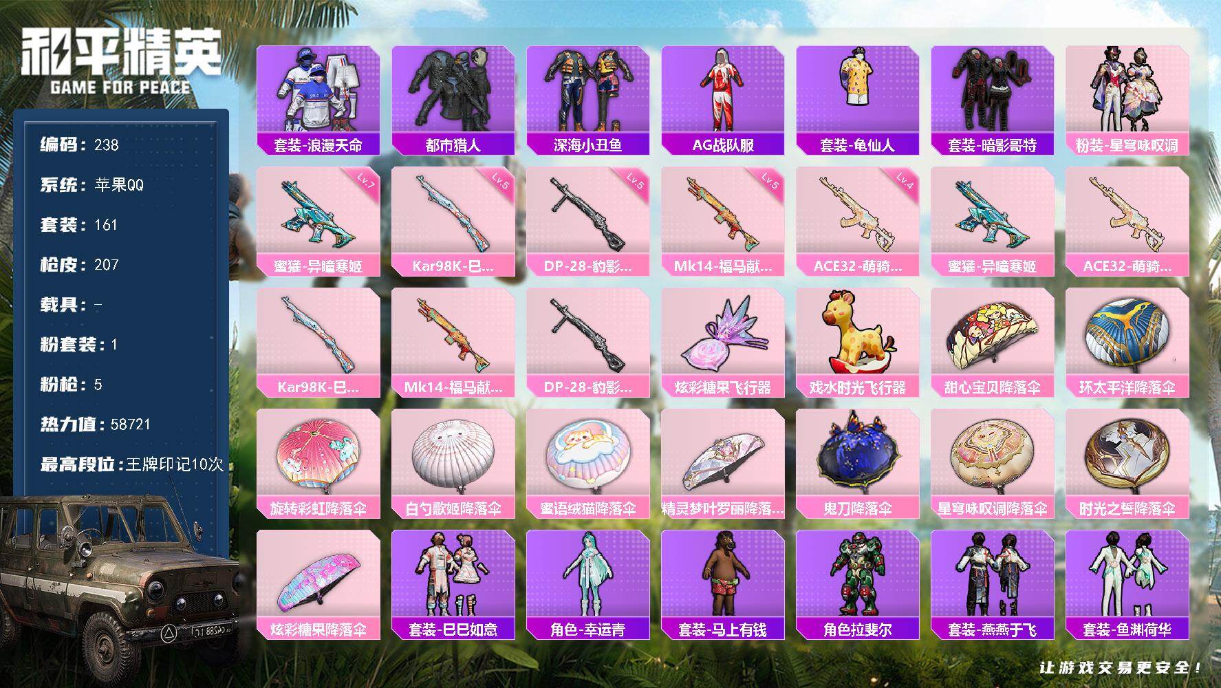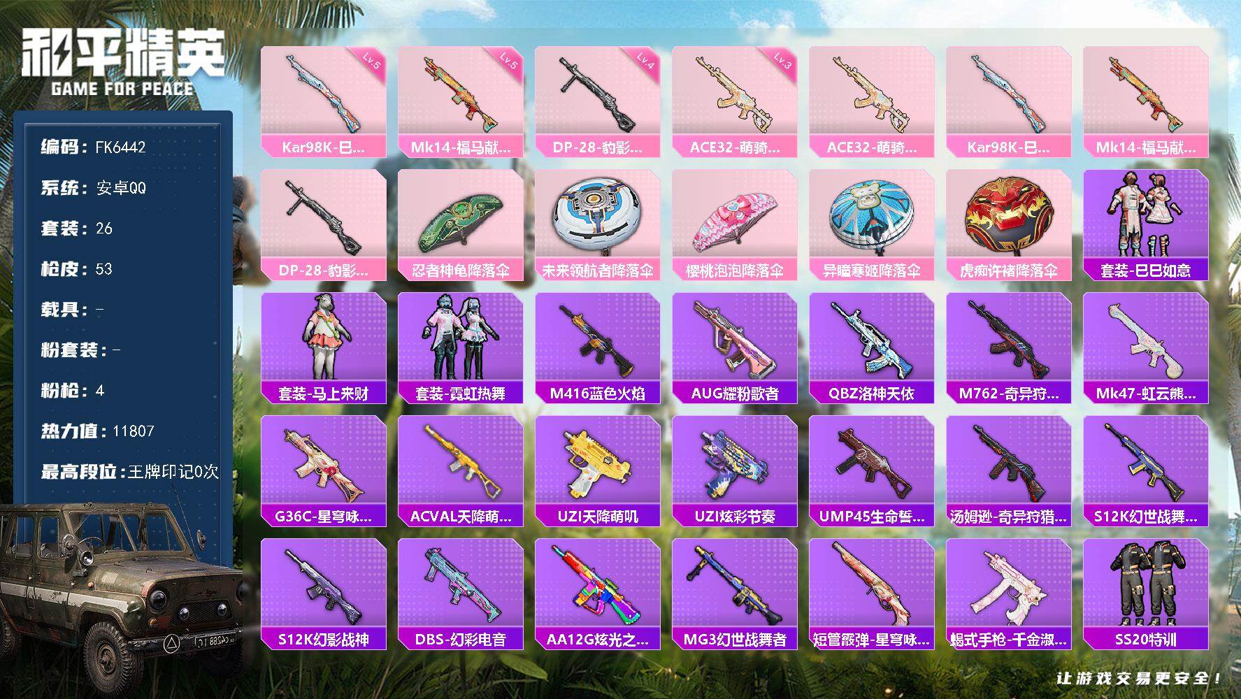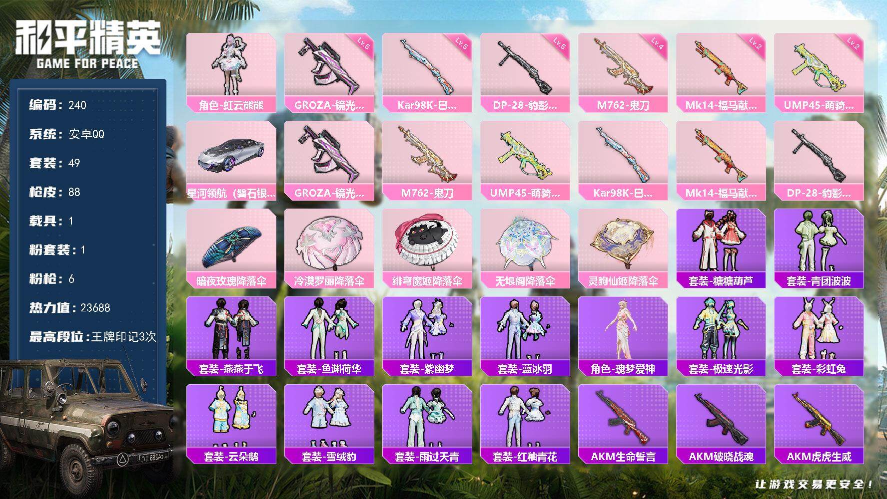 安卓手Q-1载具-1粉装-6特效枪-49套装-88枪皮-3王牌印记-不朽星钻Ⅰ-