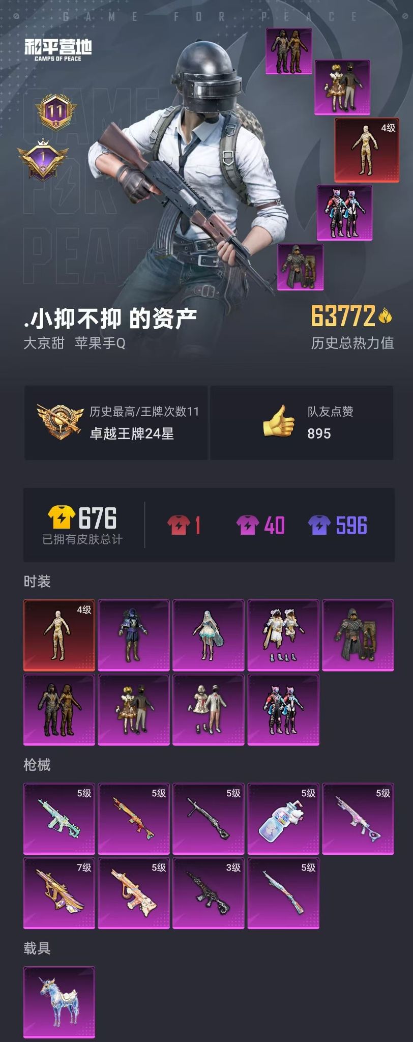 苹果手Q-3载具-3粉装-2特效枪-88套装-108枪皮-8王牌印记-坚韧铂金Ⅳ