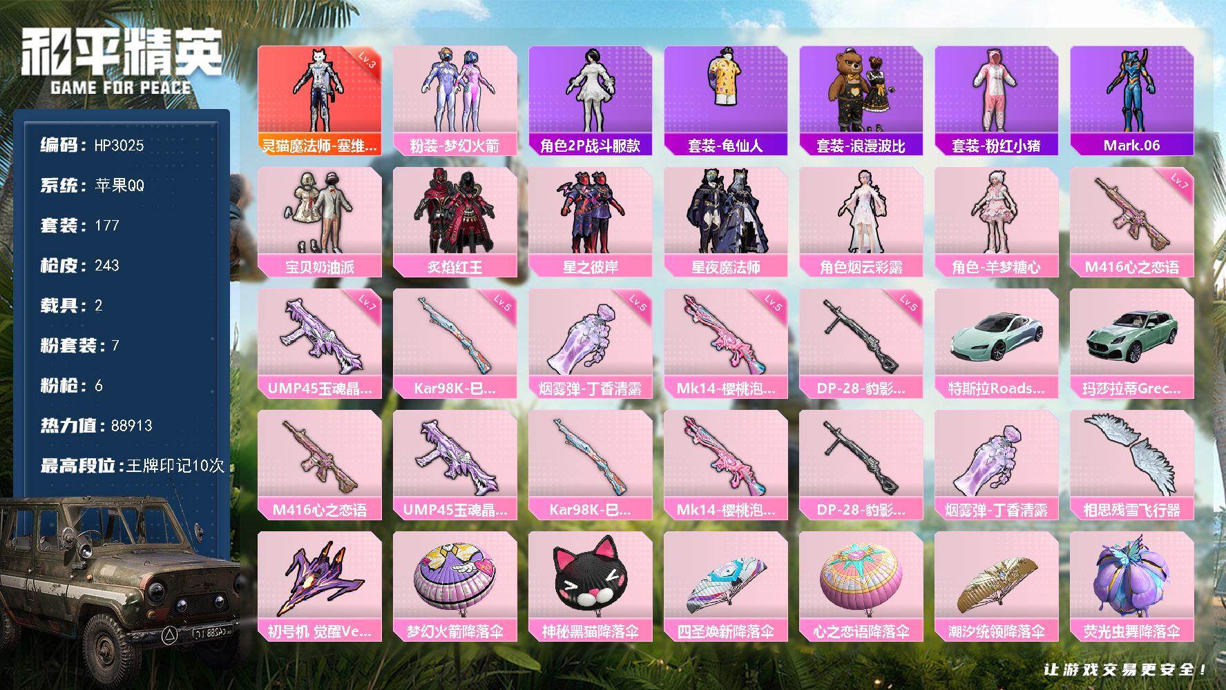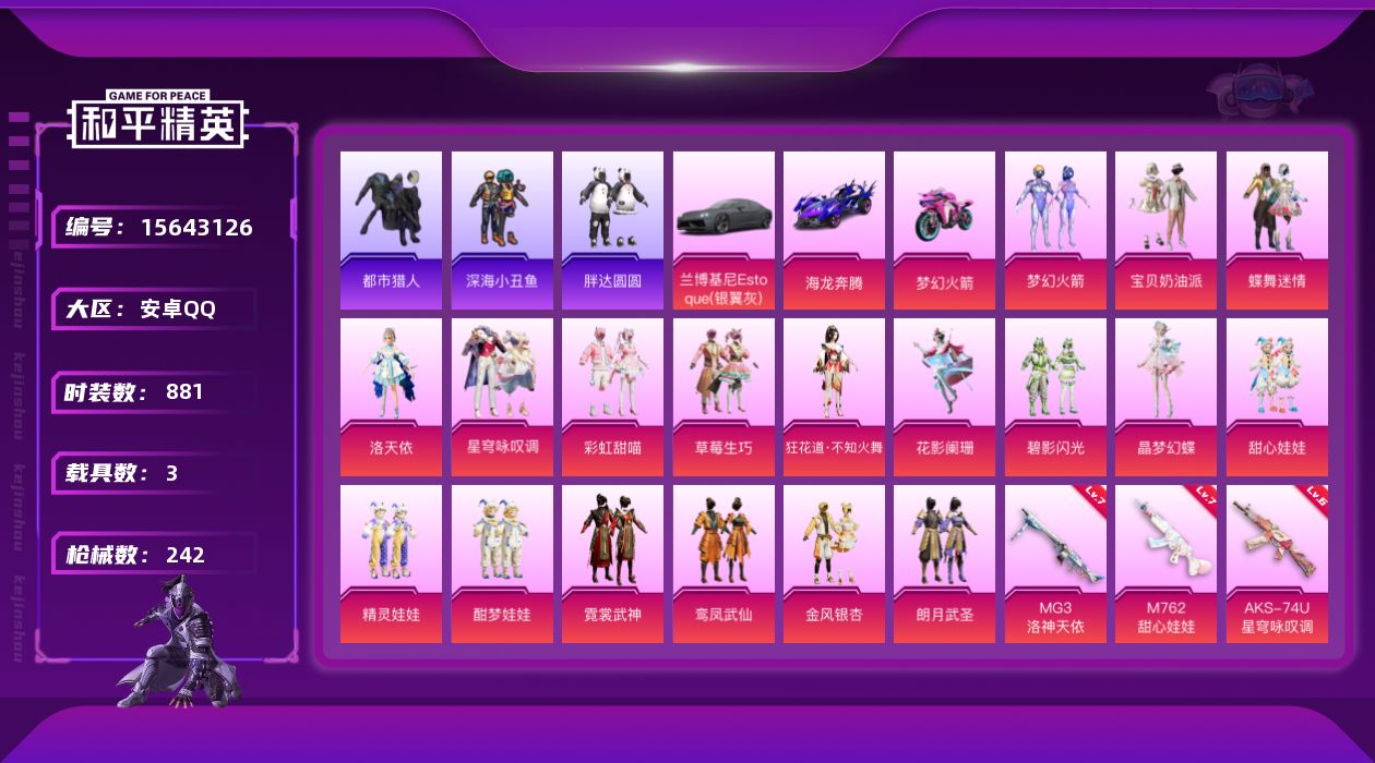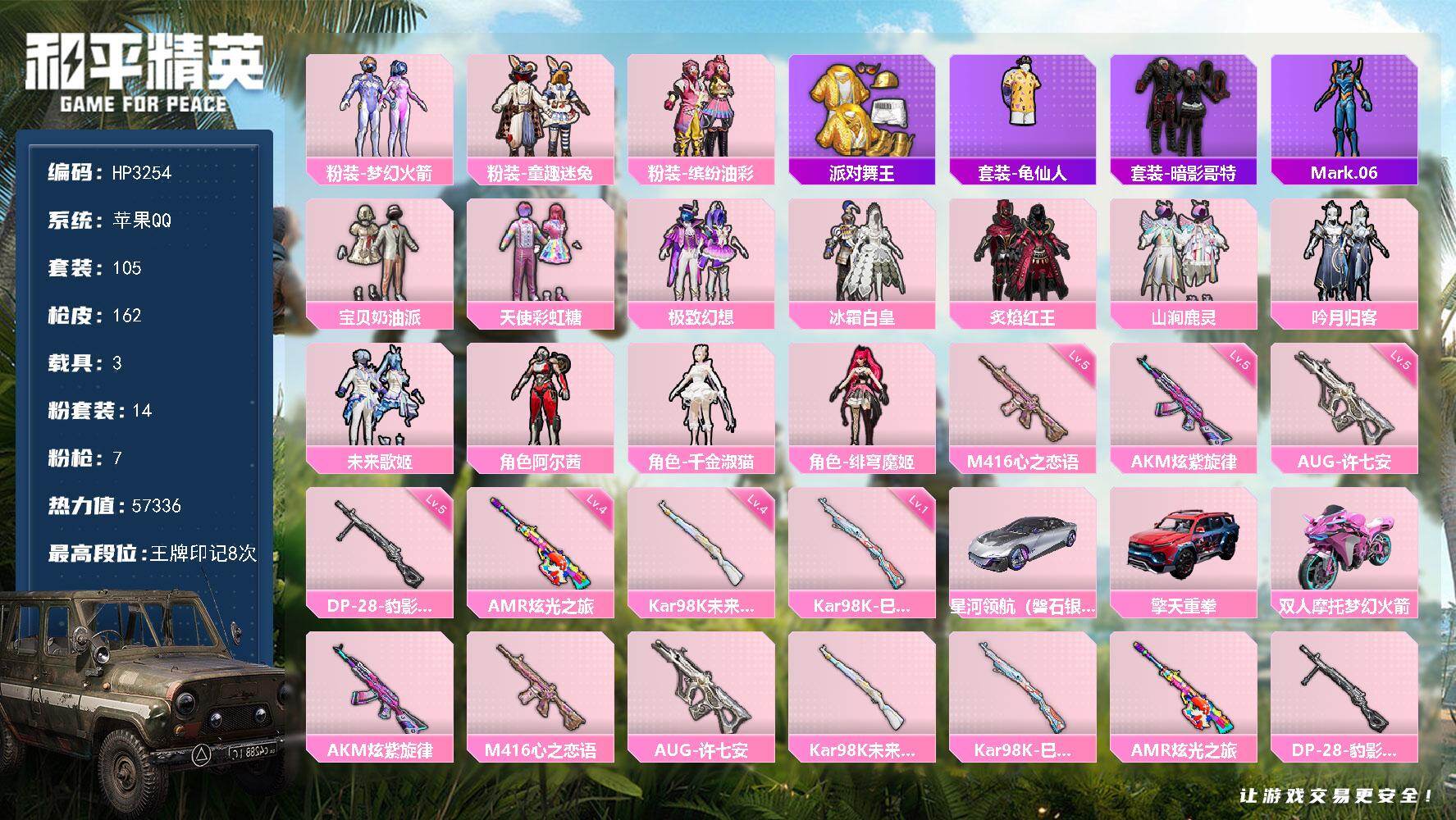 a4234/苹果QQ/热力值:83725,1神装,7粉装,9粉枪,3载具,20粉色战备,185套装,