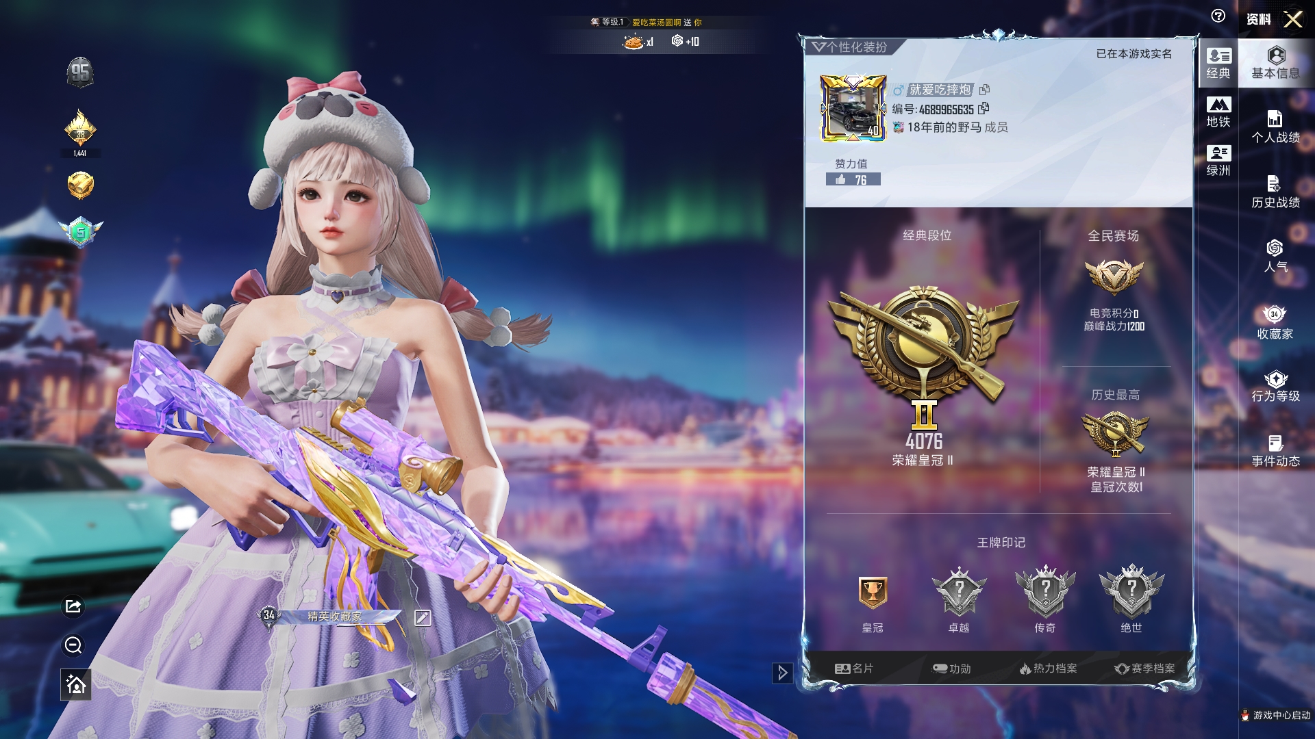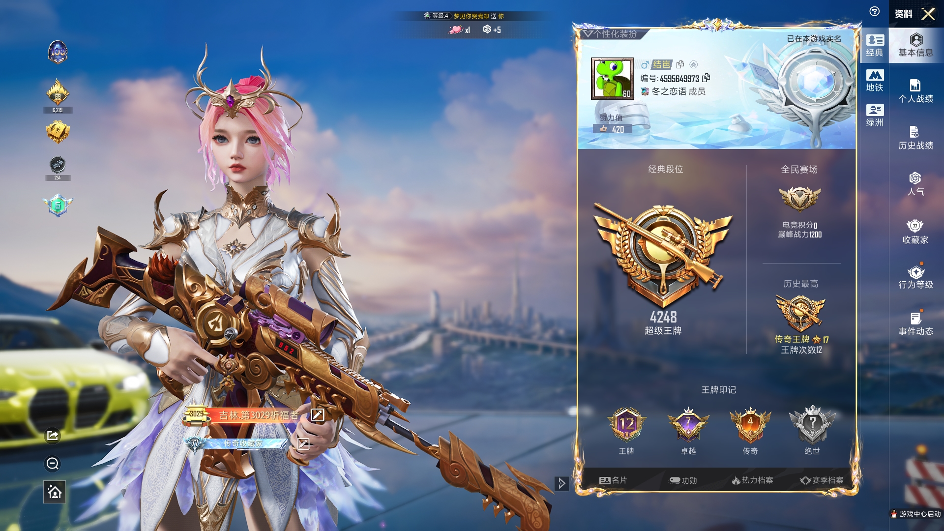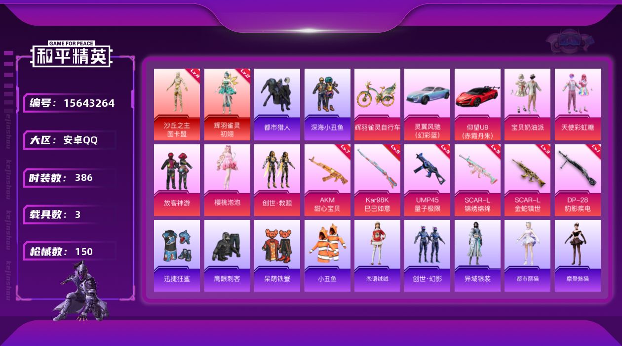 a4234/苹果QQ/热力值:83725,1神装,7粉装,9粉枪,3载具,20粉色战备,185套装,