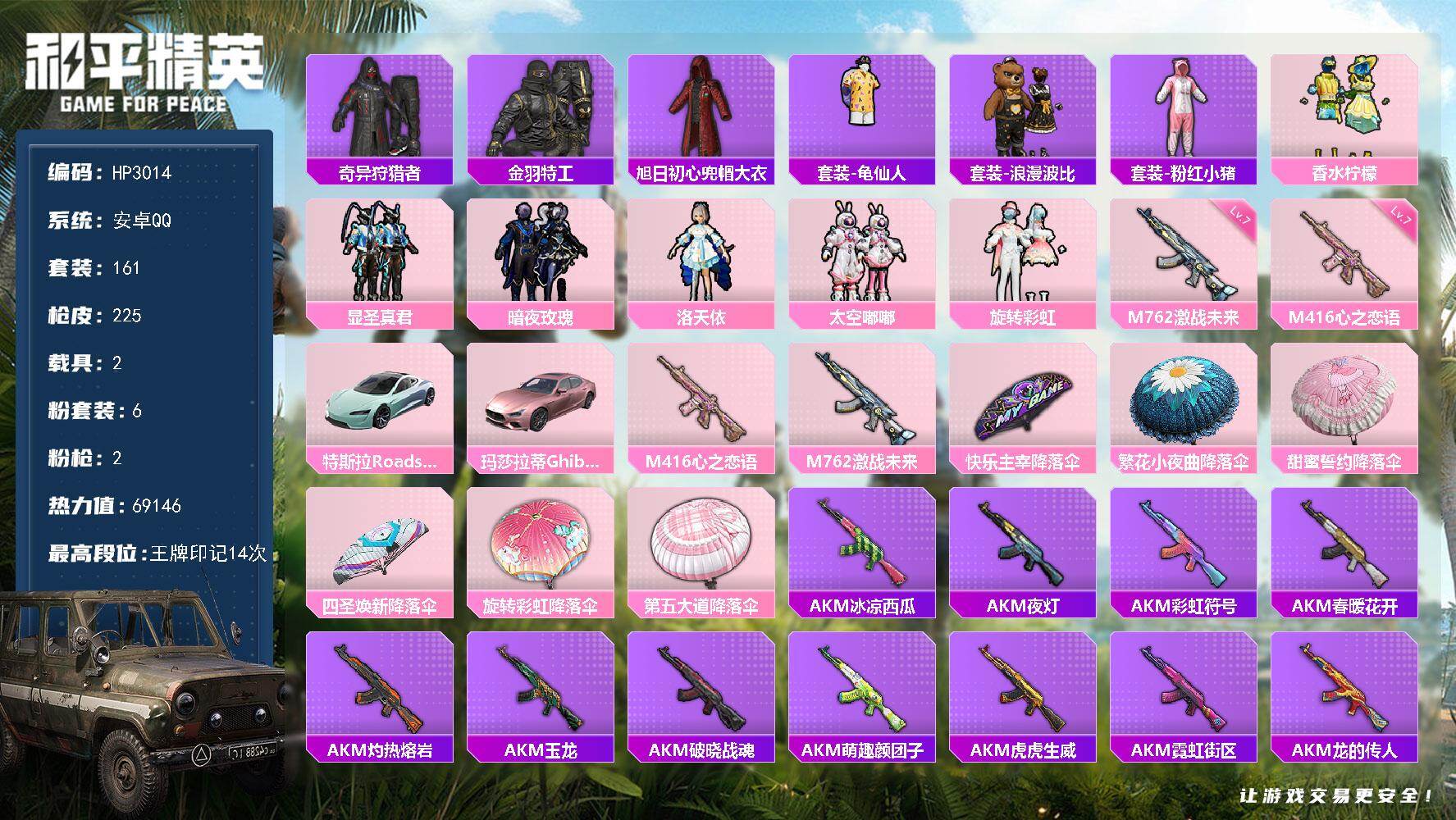 a4230/安卓QQ/热力值:88559,9粉装,17粉枪,3载具,37粉色战备,170套装,266