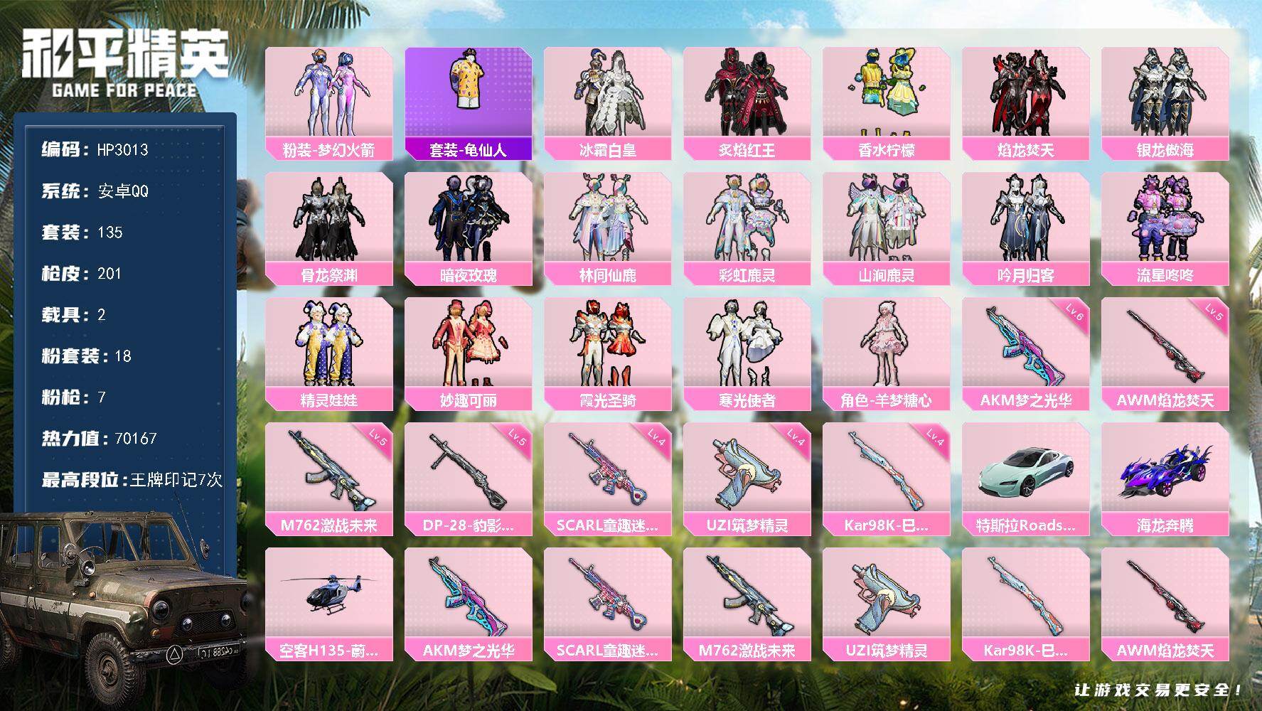安卓 手Q-18粉装-7特效枪-2载具-3粉色飞行器-70167热力值-7王牌