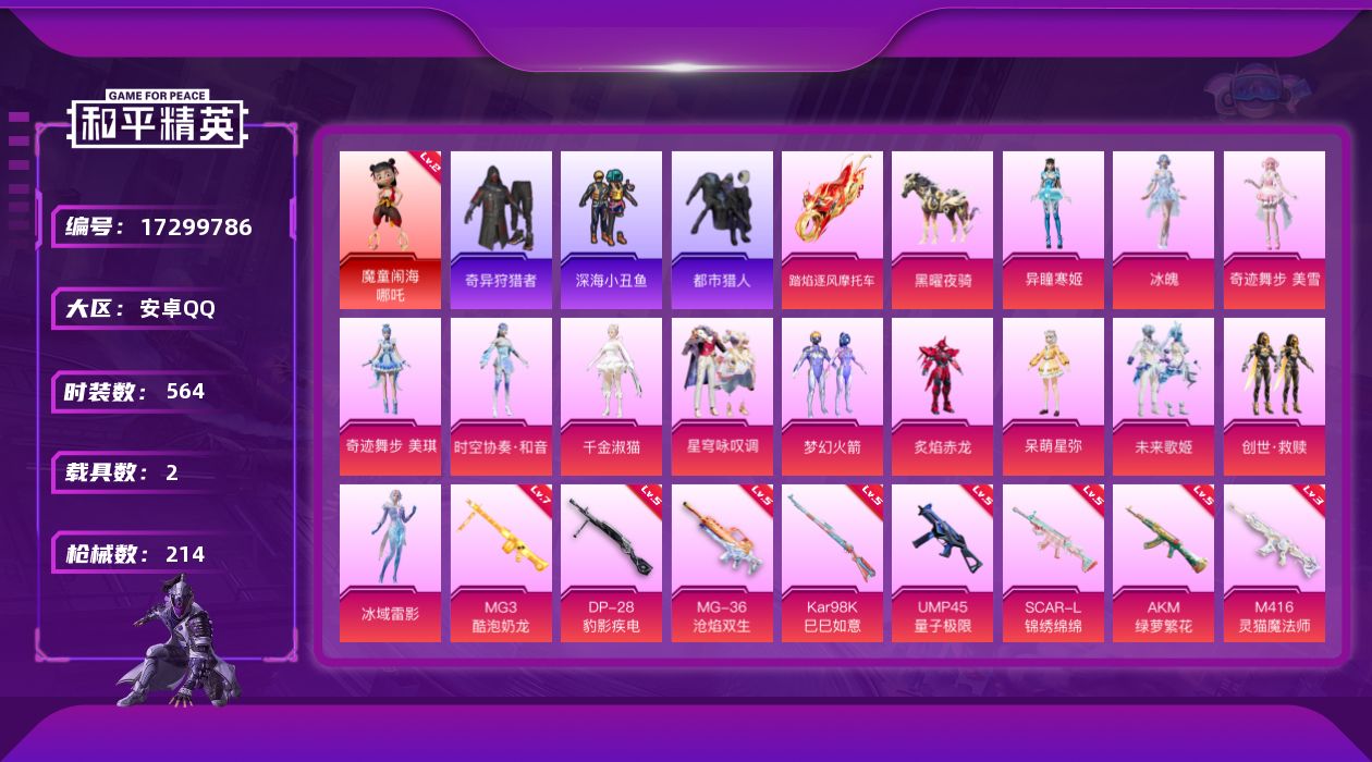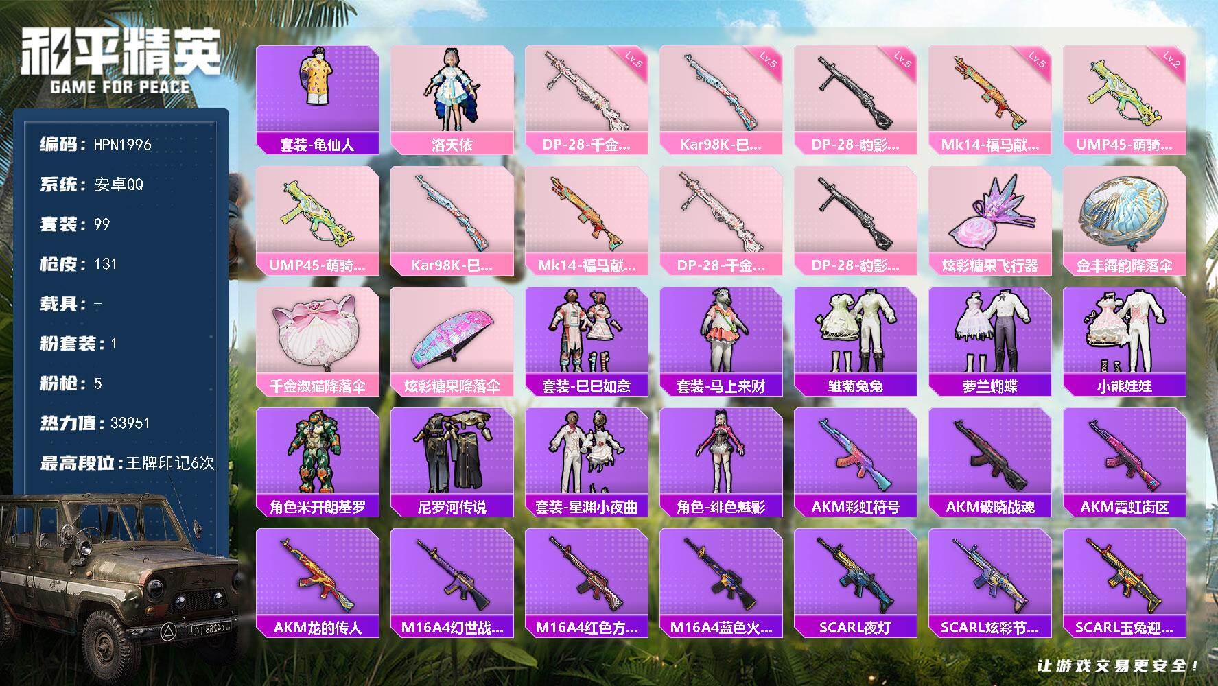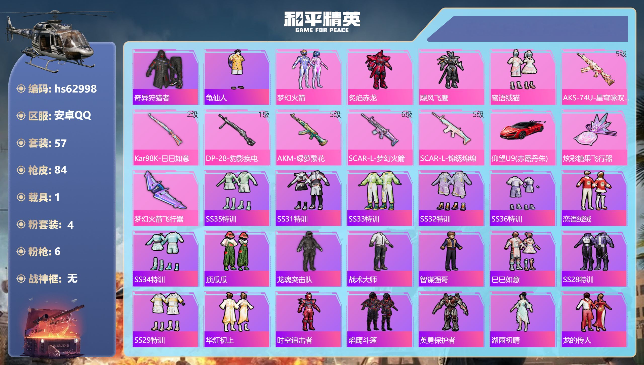 hs62998 安卓手Q-4王牌印记-4粉装-6特效枪-1载具-27599热力值-57套装-84枪皮