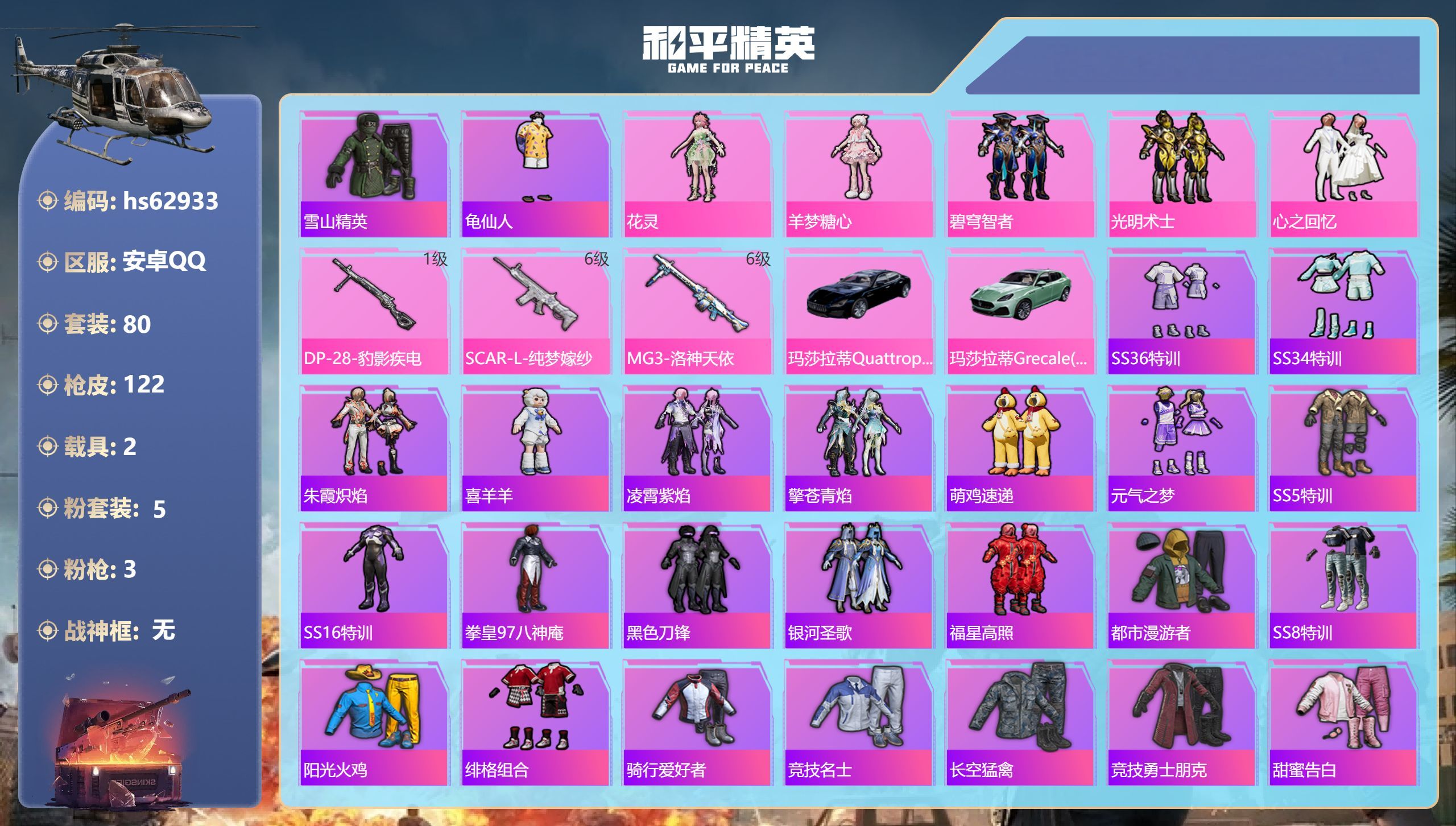 hs62933 安卓手Q-3王牌印记-5粉装-3特效枪-2载具-37016热力值-80套装-122枪