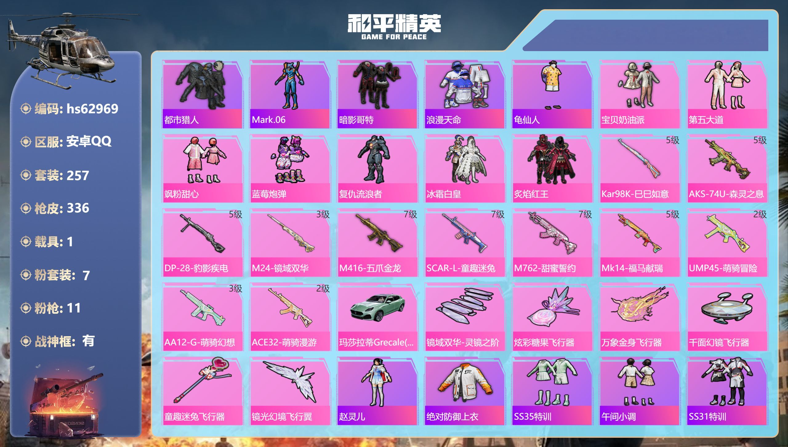 hs62969 安卓手Q-21王牌印记-有战神框-7粉装-11特效枪-1载具-106891热力值-2