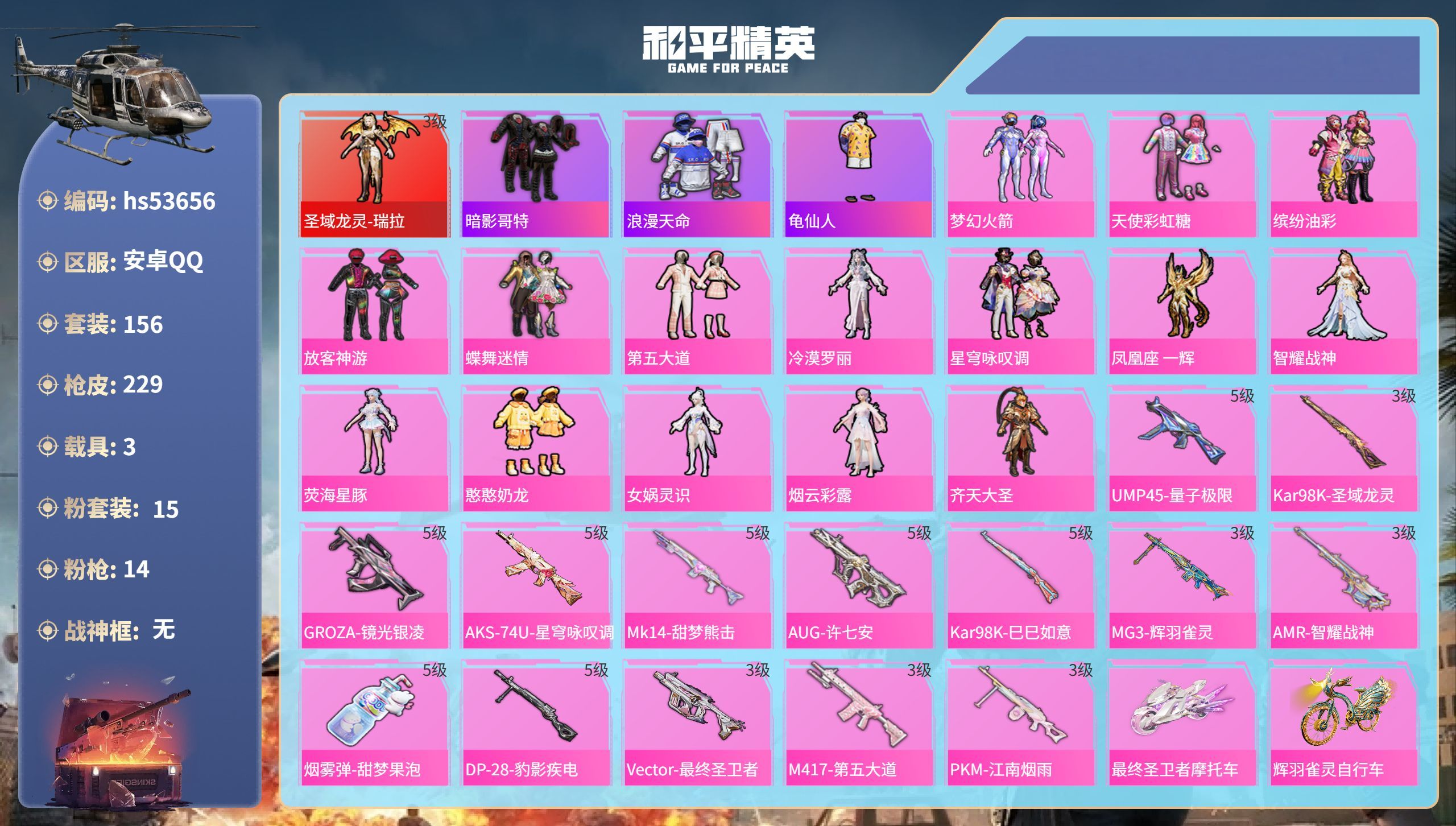 hs53656 安卓手Q-8王牌印记-1红装-15粉装-14特效枪-3载具-80904热力值-156