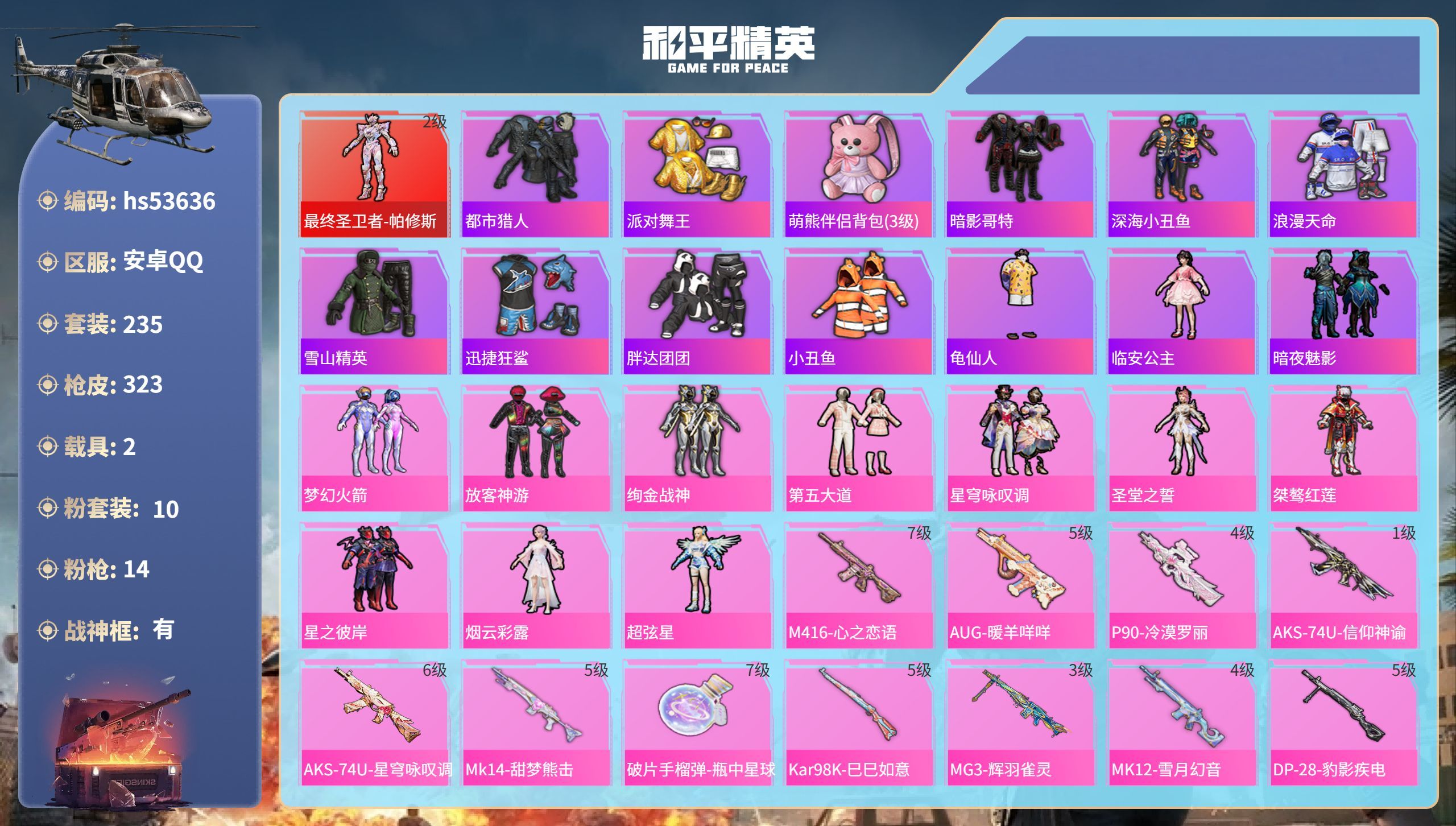 hs53636 安卓手Q-22王牌印记-有战神框-1红装-10粉装-14特效枪-2载具-113544