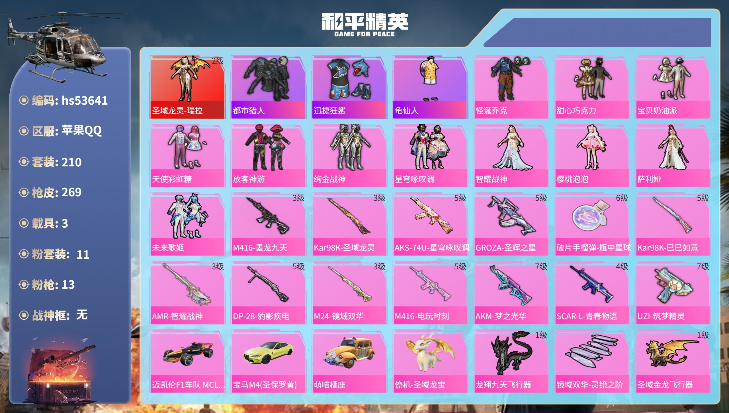 hs53659 苹果手Q-13王牌印记-有战神框-3粉装-11特效枪-3载具-52661热力值-91