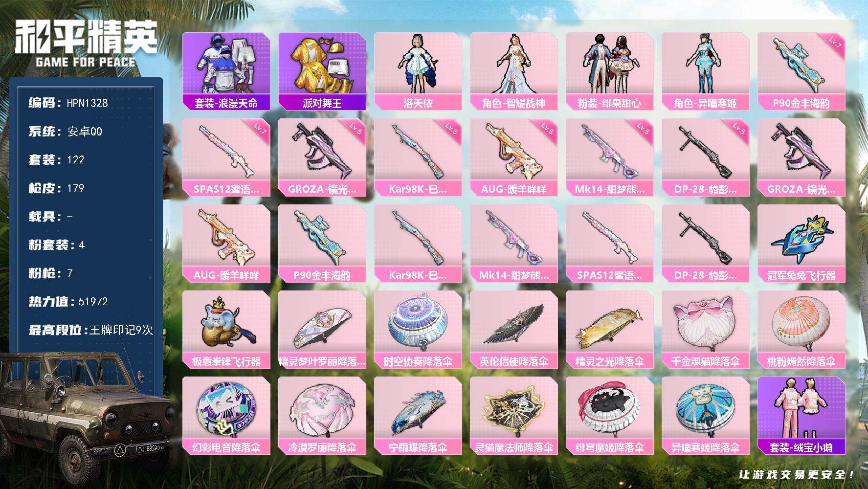 安卓手Q-3王牌印记-10粉装-6特效枪-4载具-54917热力值-111套装-13