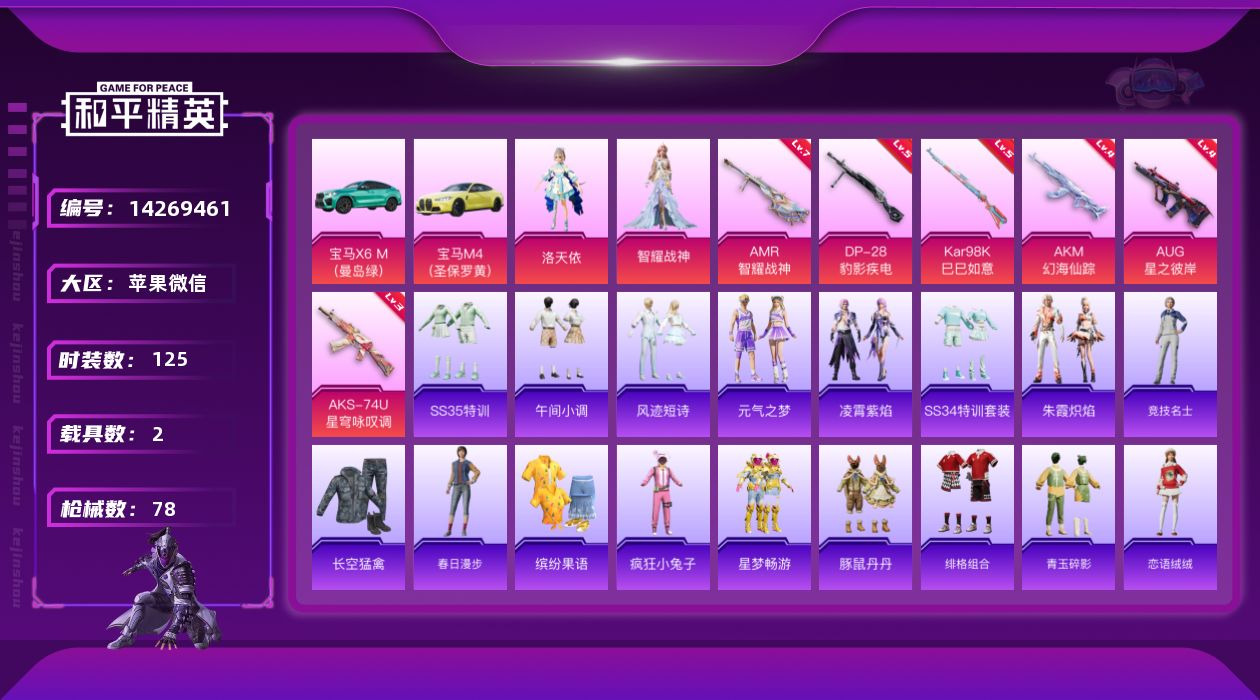 苹果v-3王牌印记-4粉装-6特效枪-2载具-30668热力值-74套装-108枪