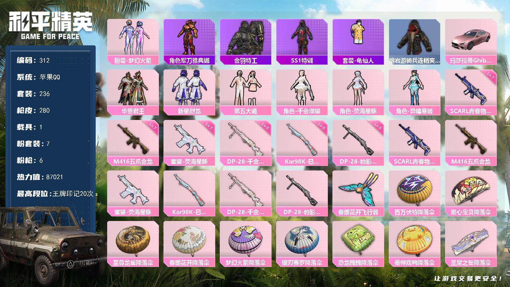 苹果 手Q-7粉装-6特效枪-1载具-1粉色飞行器-87021热力值-20王牌
