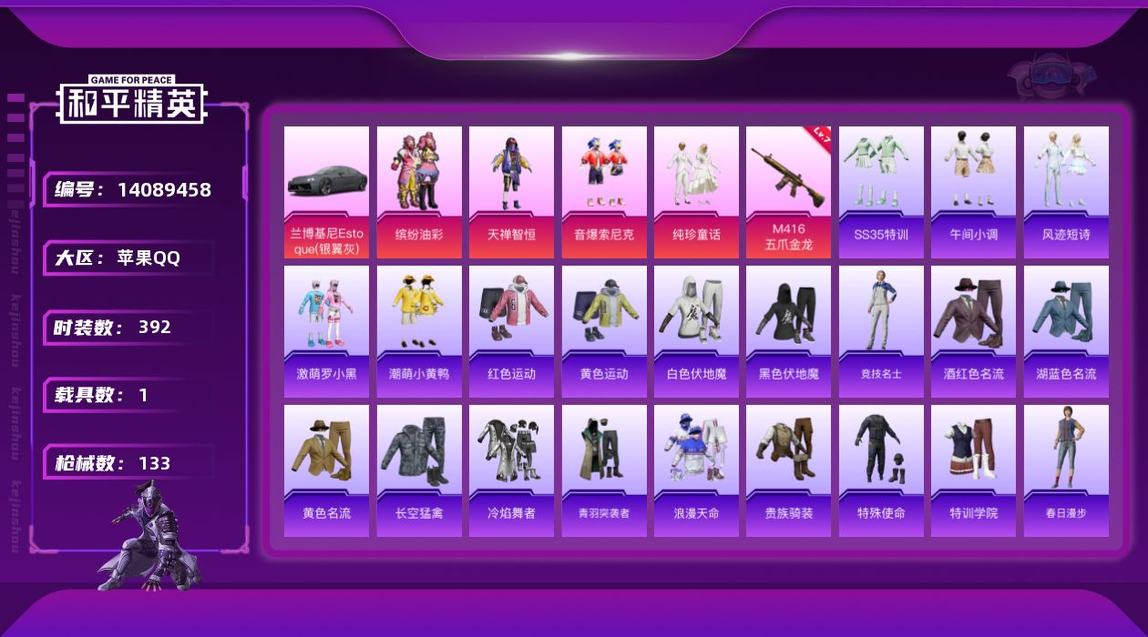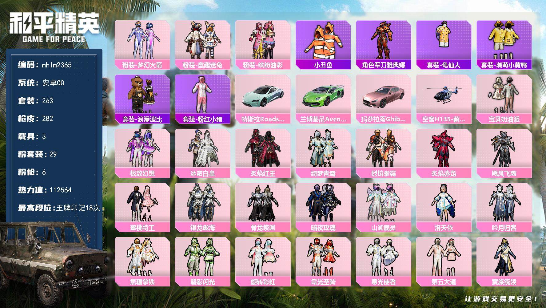 安卓 手Q-1神装-2粉装-4特效枪-1载具-4粉色飞行器-39482热力值-