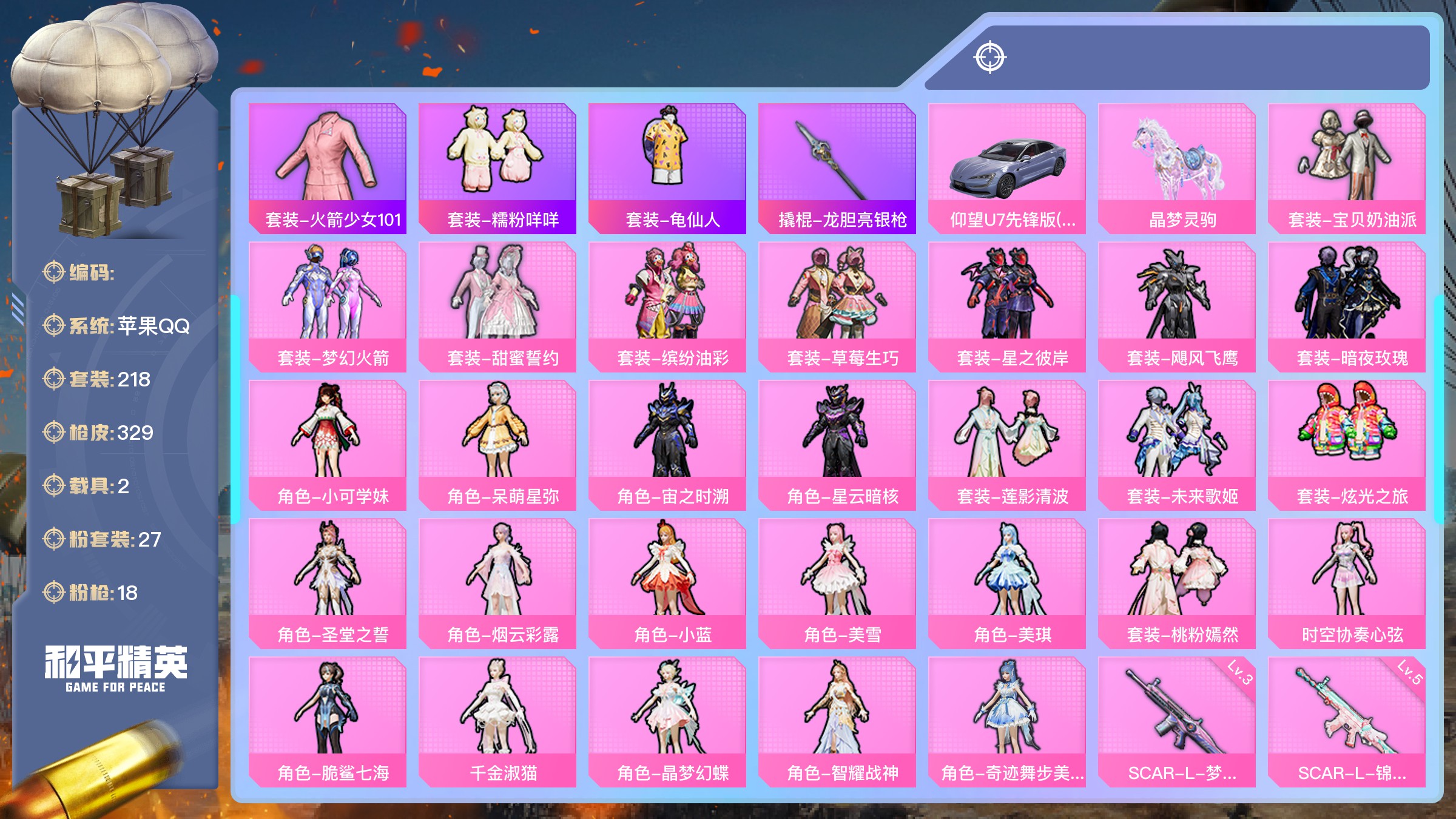 苹果 手Q-14粉装-2特效枪-2载具-3粉色飞行器-45428热力值-1王牌