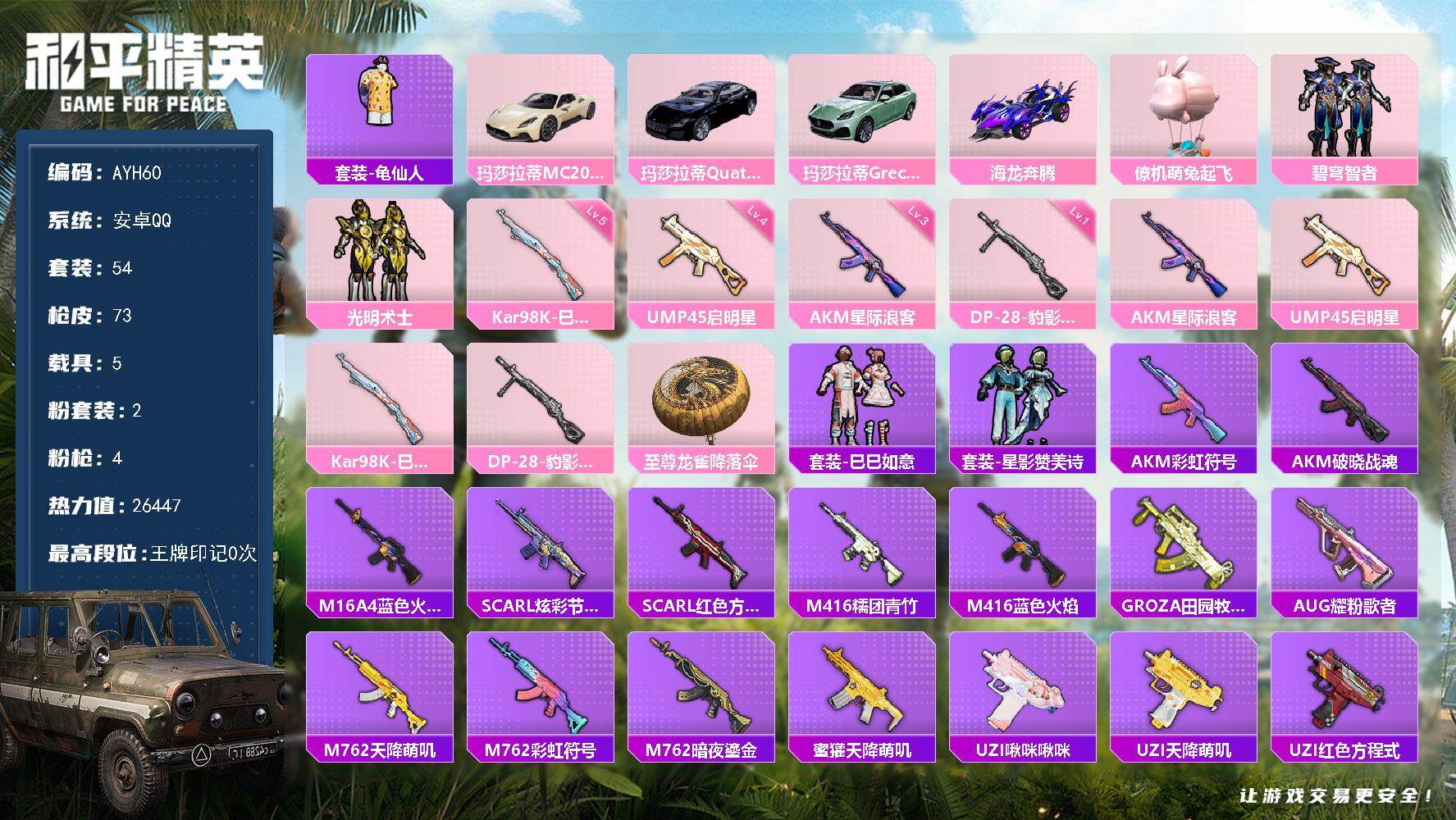 【店主推荐捡漏号!可直接换绑】安卓 手Q-2粉装-4特效枪-5载具-0粉色飞行
