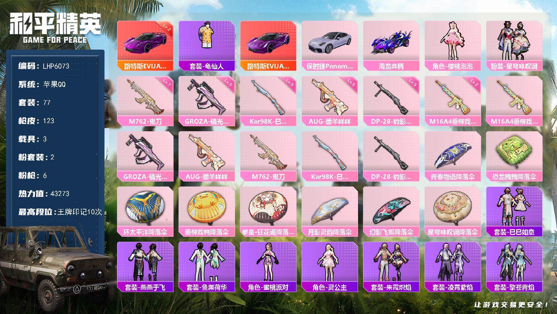 a4107/苹果QQ/-12王牌印记-7粉装-8特效枪-2载具-77207热力值-180套装-252