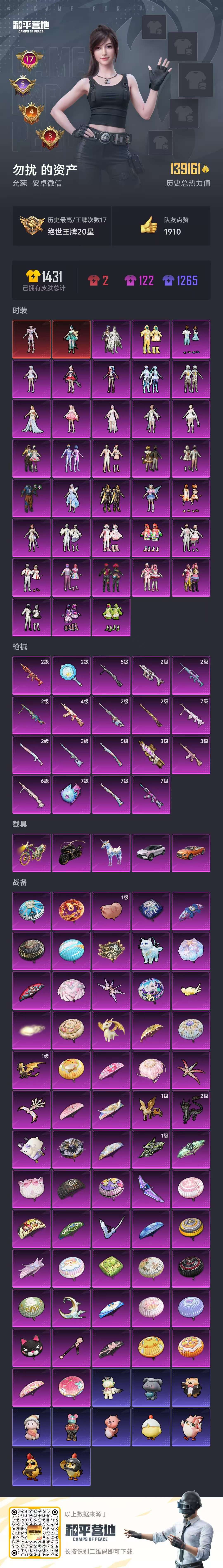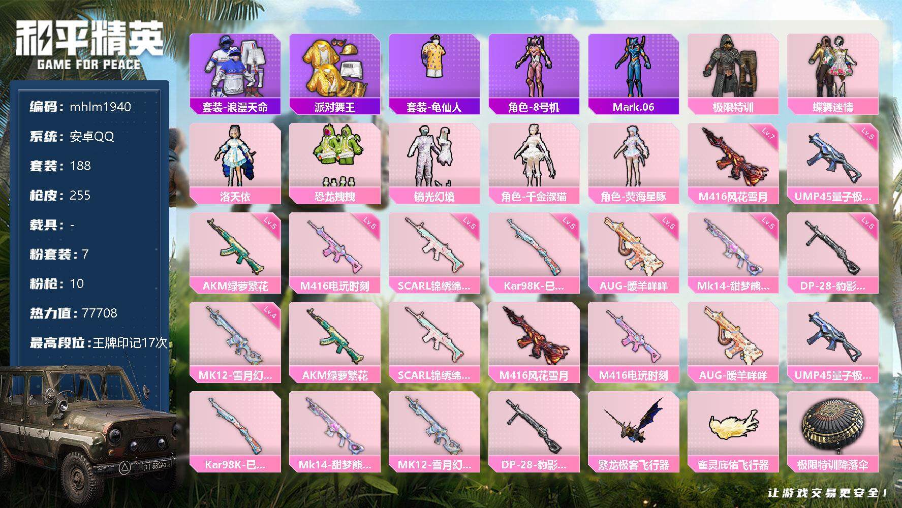 a4098/苹果QQ/-11王牌印记-7粉装-9特效枪-3载具-58192热力值-116套装-175