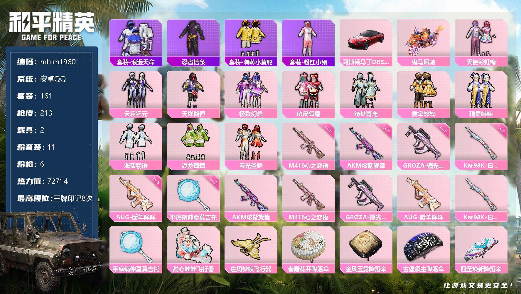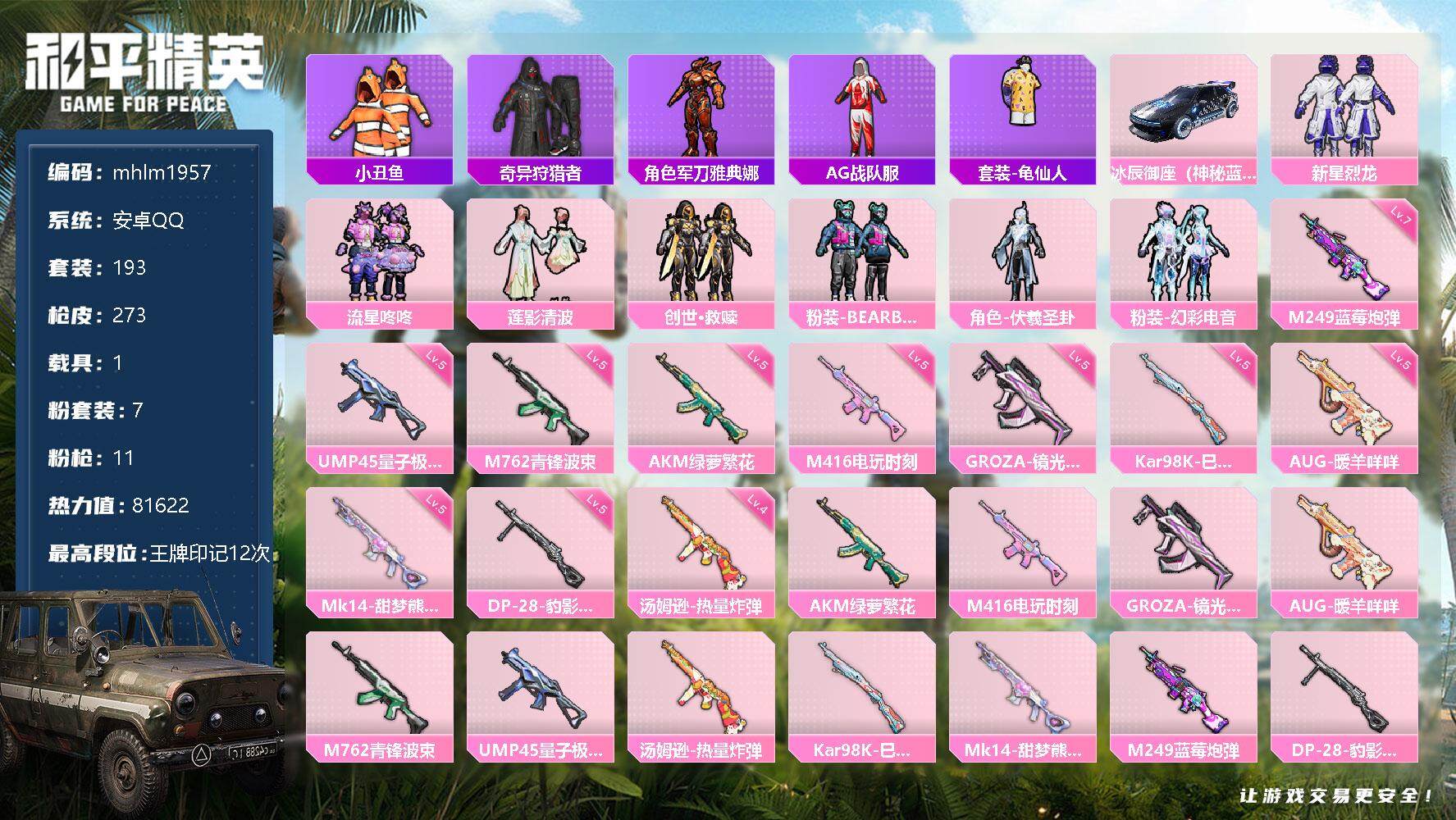 hs49069 安卓手Q-13王牌印记-12粉装-6特效枪-2载具-56555热力值-147套装-1